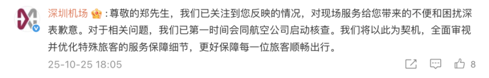 10月25日傍晚,深圳机场官方微博在郑智化在微博文章下评论称,“尊敬的郑先生,我们已关注到您反映的情况,对现场服务给您带来的不便和困扰深表歉意。对于相关问题,我们已第一时间会同航空公司启动核查。我们将以此为契机,全面审视并优化特殊旅客的服务保障细节,更好保障每一位旅客顺畅出行。”