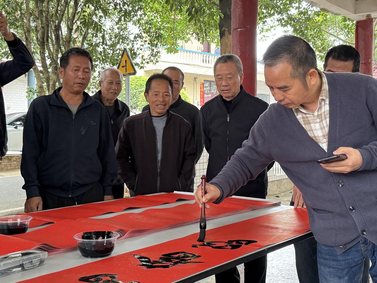“门前三小”凉亭内,红联铺展,宣纸沁香,墨气与桂香缠缠绕绕,漫过青砖石凳。县文联副主席唐洪波与书协会员围坐案前,凝神为村民书就婚庆的喜联、乔迁的吉语、寿辰的贺词,连来年的春联也早早备下。县书协陈主席抬眼望——田垄如裁,村道无尘,新屋鳞次栉比,便援笔而就“沃野新韵”四字。笔锋落处,既有稻穗的柔润,又含炊烟的温暖,他指尖沾着墨痕笑叹:“这村子的新气,是从泥土里冒出来的,得用最实在的笔意,才配得上这份鲜活。”