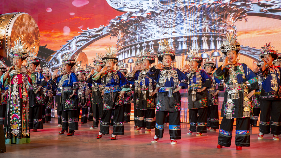 仪式上的文艺表演精彩绝伦。由保靖县苗族鼓舞县级非遗代表性传承人龙梅翠整编的苗族《元鼓》鼓舞,将苗族先民四季劳作动作与姑娘女红刺绣动作巧妙融合,强劲的鼓点与灵动的舞姿交织出极致的视听盛宴。苗族大歌《吉宝颂》歌声里满是“山水村庄欢聚一堂,湘西美景等你来”的热情邀约,独特的苗族高腔的悠扬旋律,展现出浓郁的民族文化特色。“我们因这首歌曲而聚在一起,用我们苗族特有的语言,创新和声唱法,展现我们的民族自信。”来自花垣县的《吉宝颂》创作者陶光荣分享说。