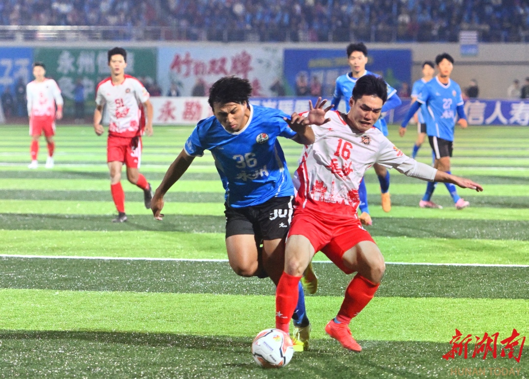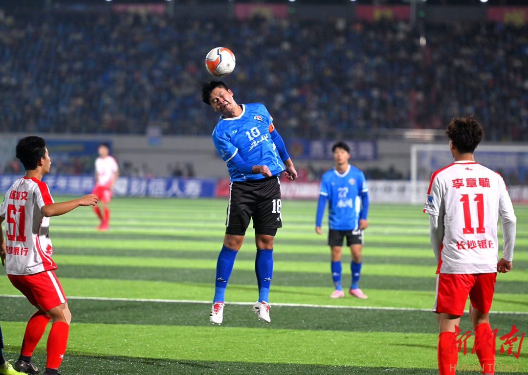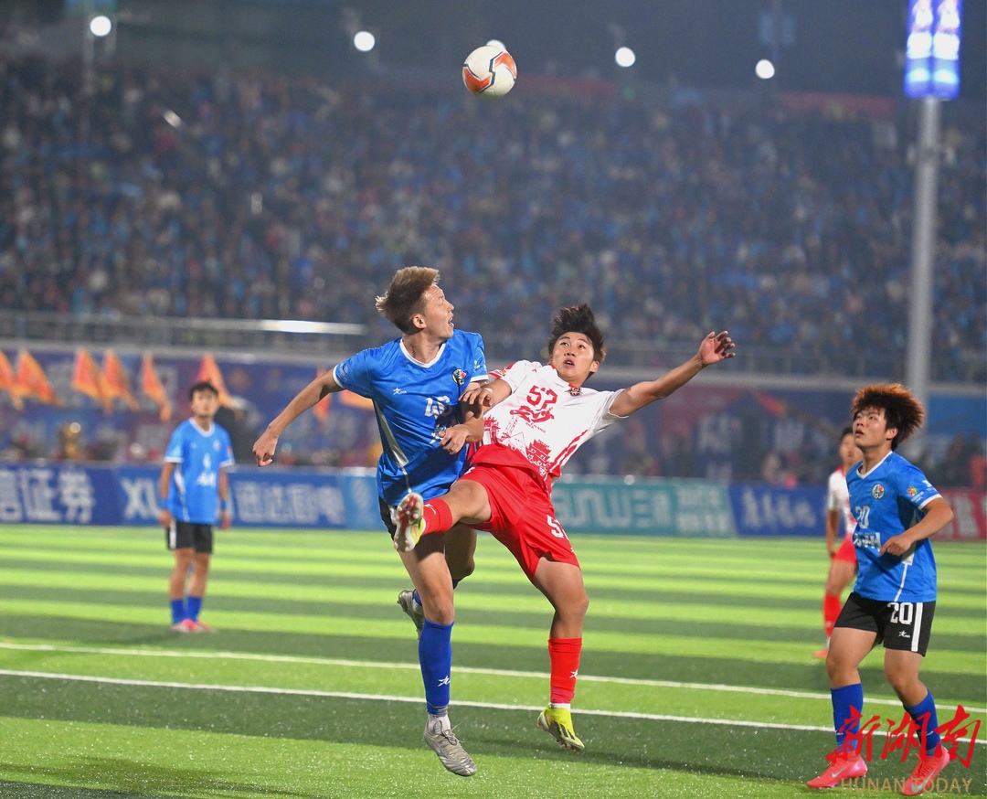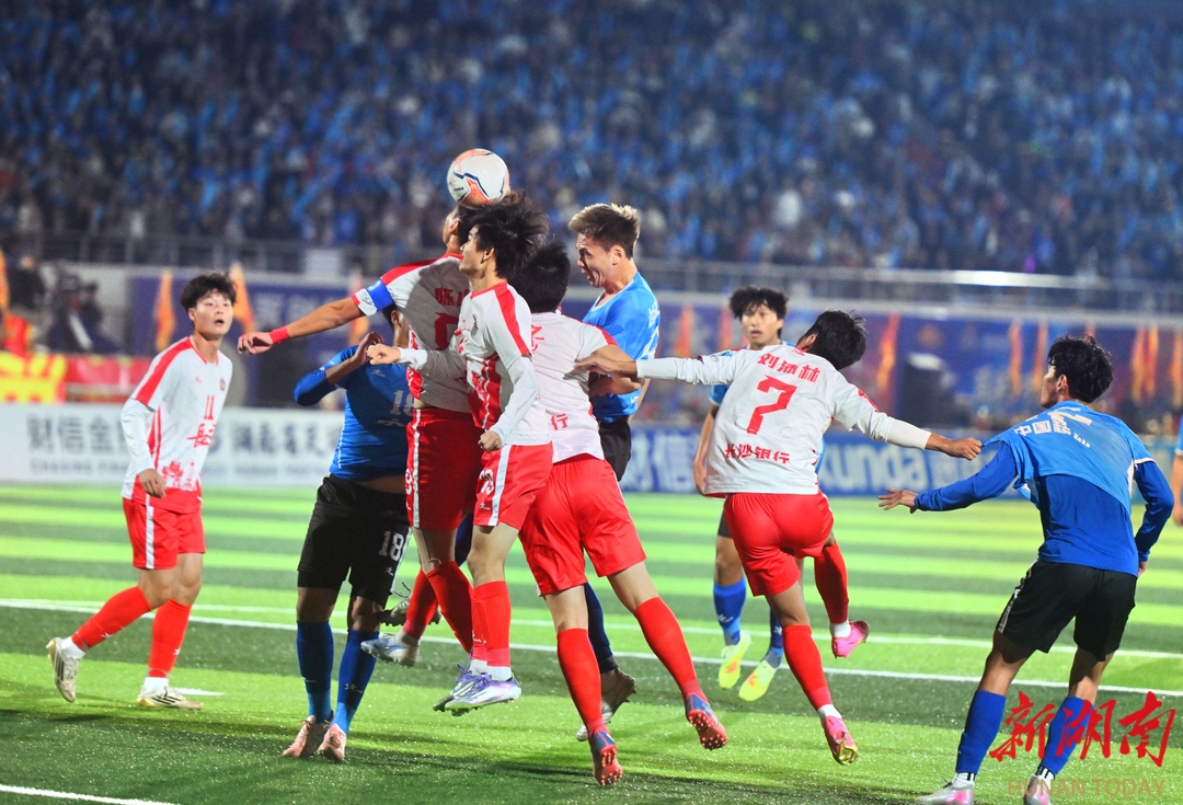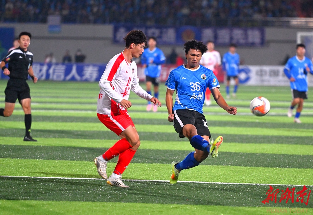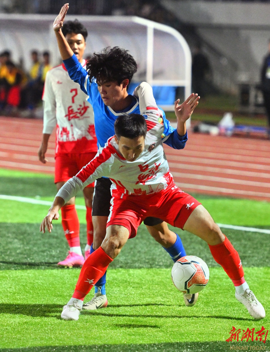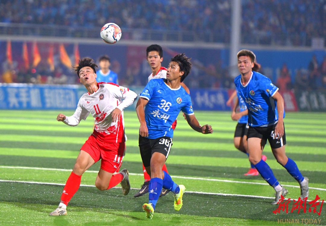 10月26日晚,双方球员在比赛中激烈对战。当晚,湘超联赛第七轮火热开战,永州队主场迎战长沙队,此场硬仗的热度备受关注。第9分钟,永州队先破长沙队球门,长沙队保持六轮的“金身”终于被打破。最终,永州队主场1比1战平长沙队。湖南日报全媒体记者 郭立亮 摄