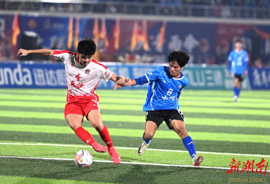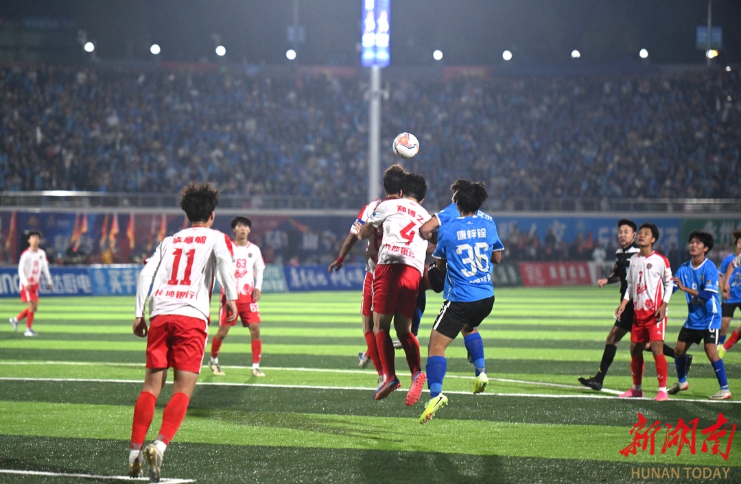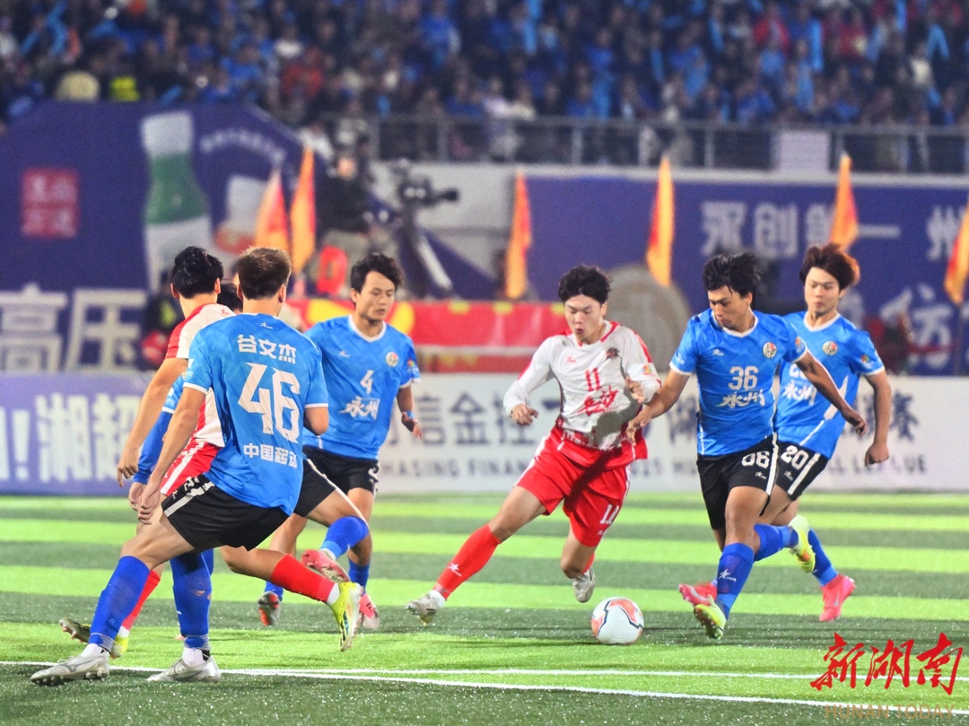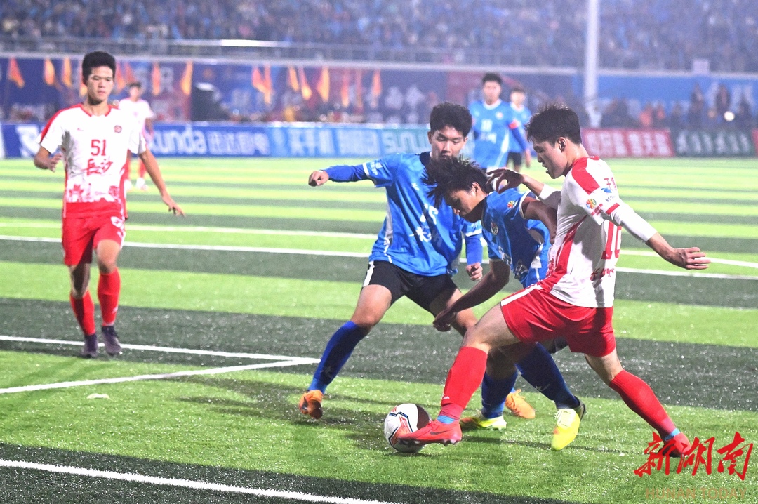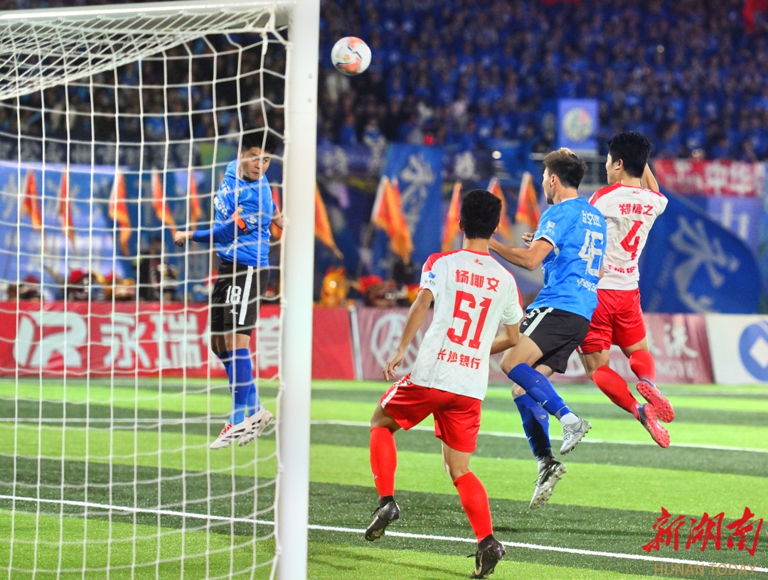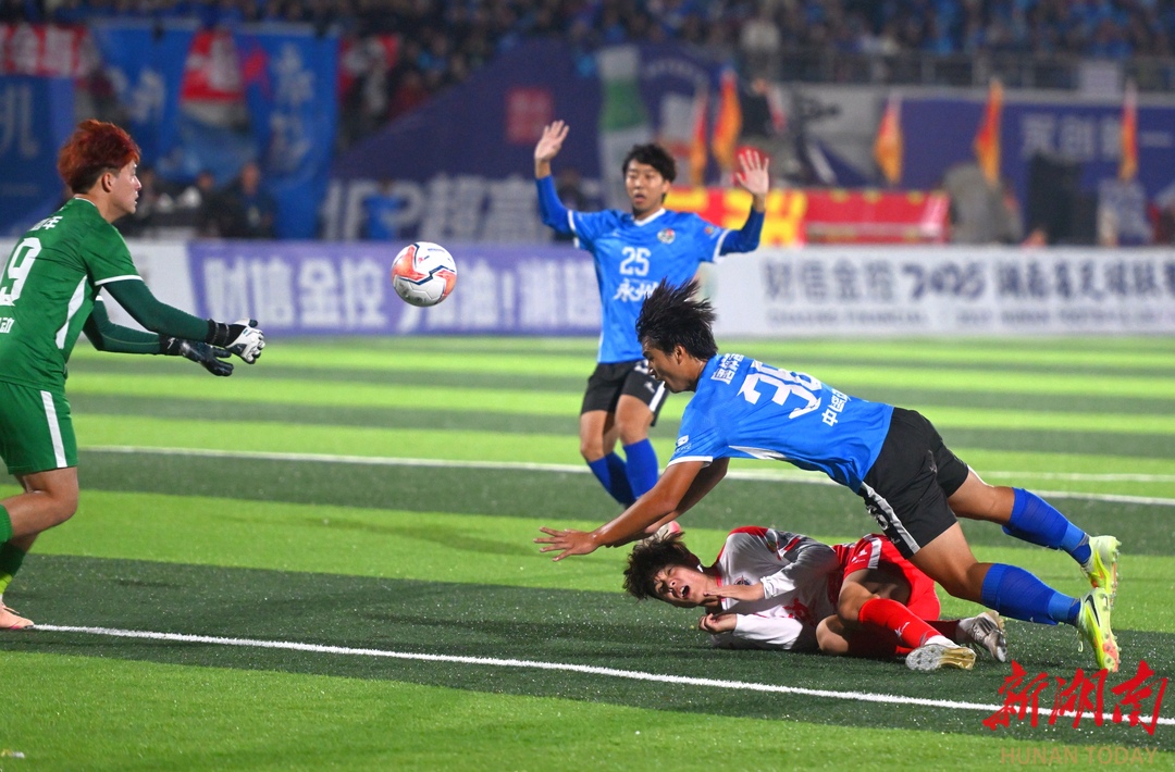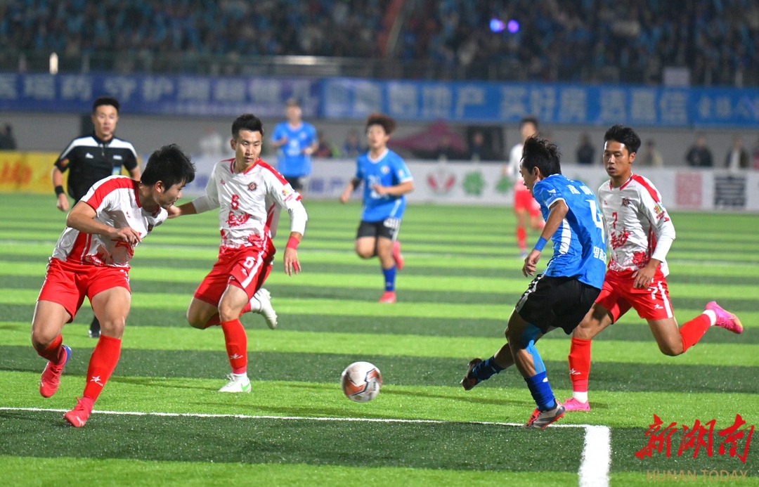 10月26日晚,双方球员在比赛中激烈对战。当晚,湘超联赛第七轮火热开战,永州队主场迎战长沙队,此场硬仗的热度备受关注。第9分钟,永州队先破长沙队球门,长沙队保持六轮的“金身”终于被打破。最终,永州队主场1比1战平长沙队。湖南日报全媒体记者 郭立亮 摄