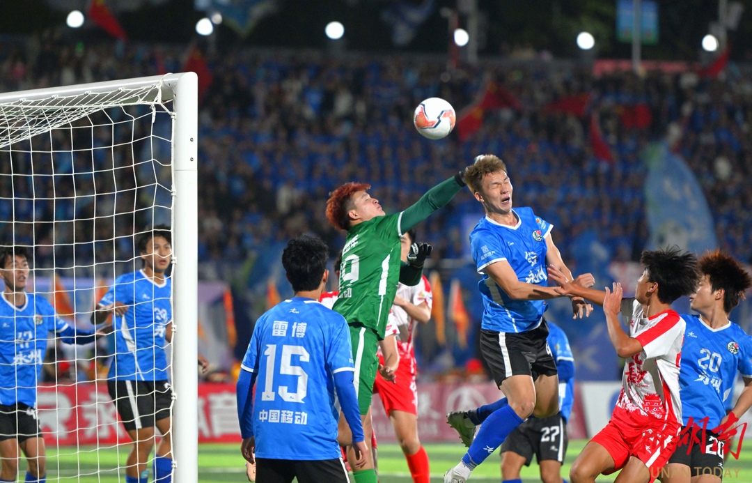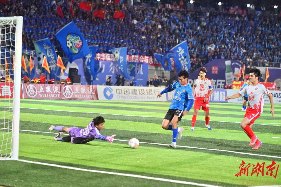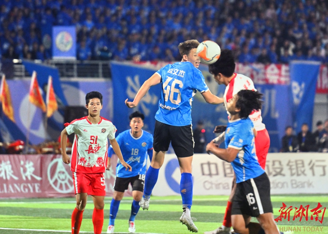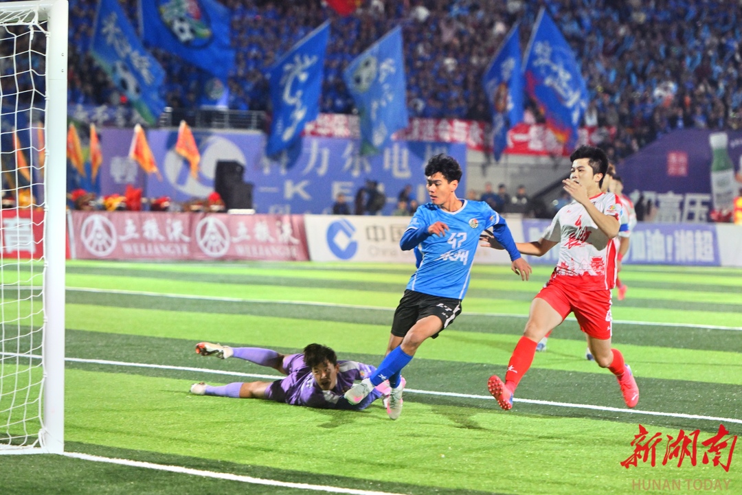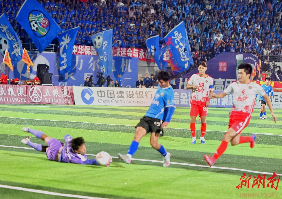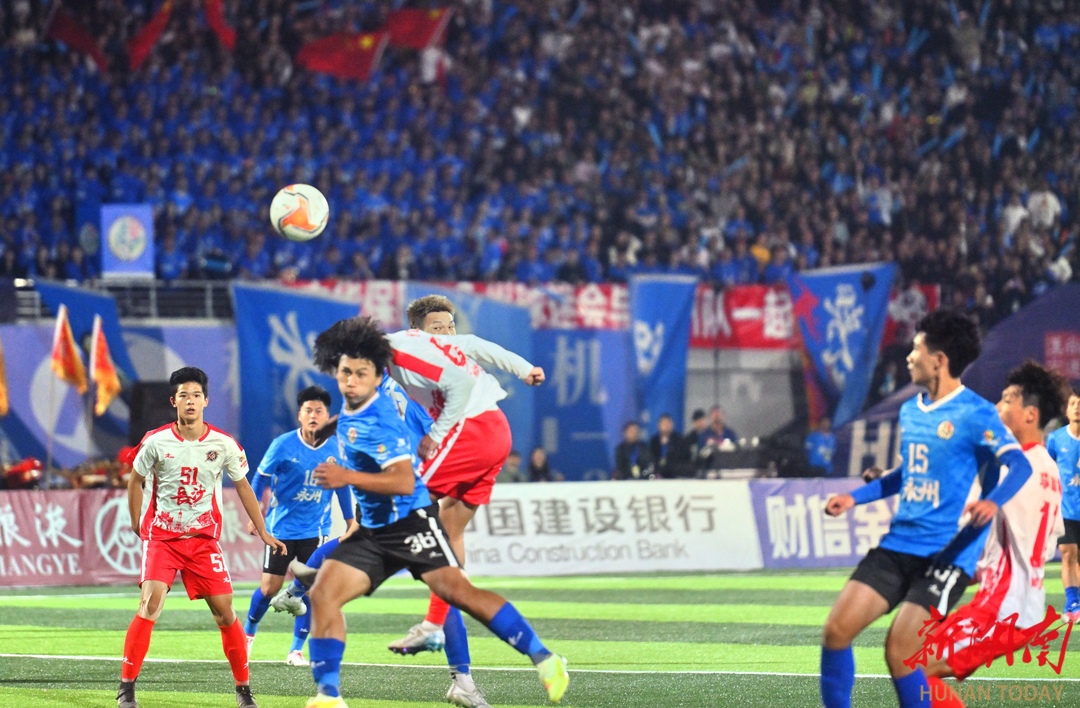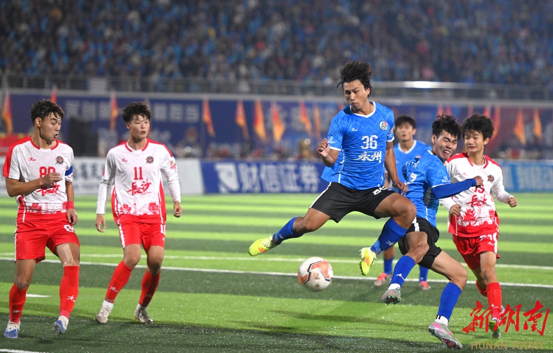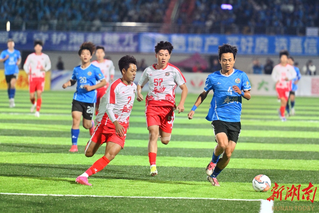 10月26日晚,双方球员在比赛中激烈对战。当晚,湘超联赛第七轮火热开战,永州队主场迎战长沙队,此场硬仗的热度备受关注。第9分钟,永州队先破长沙队球门,长沙队保持六轮的“金身”终于被打破。最终,永州队主场1比1战平长沙队。湖南日报全媒体记者 郭立亮 摄