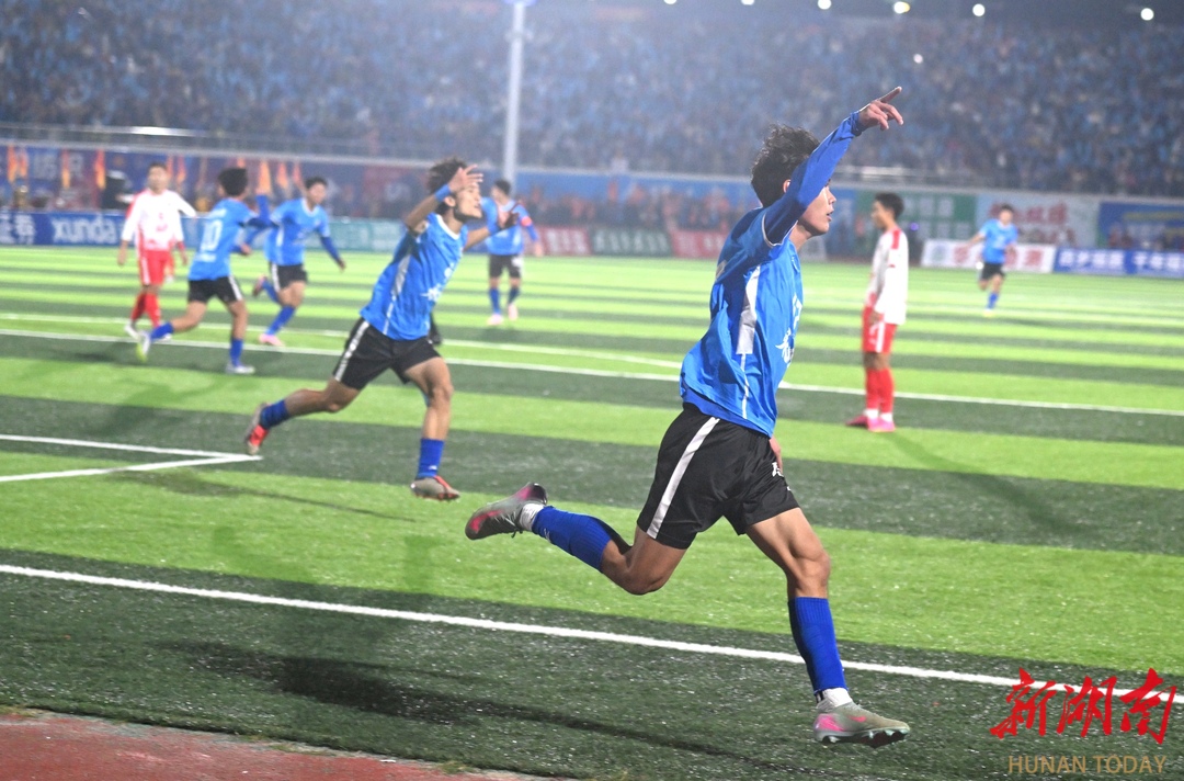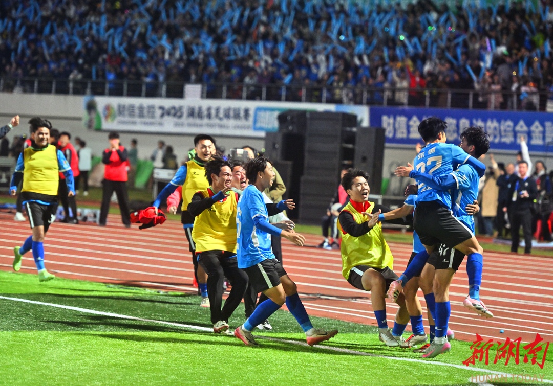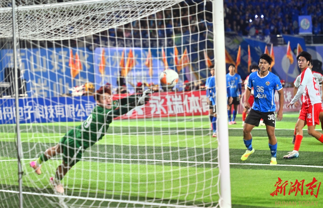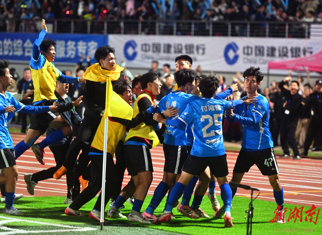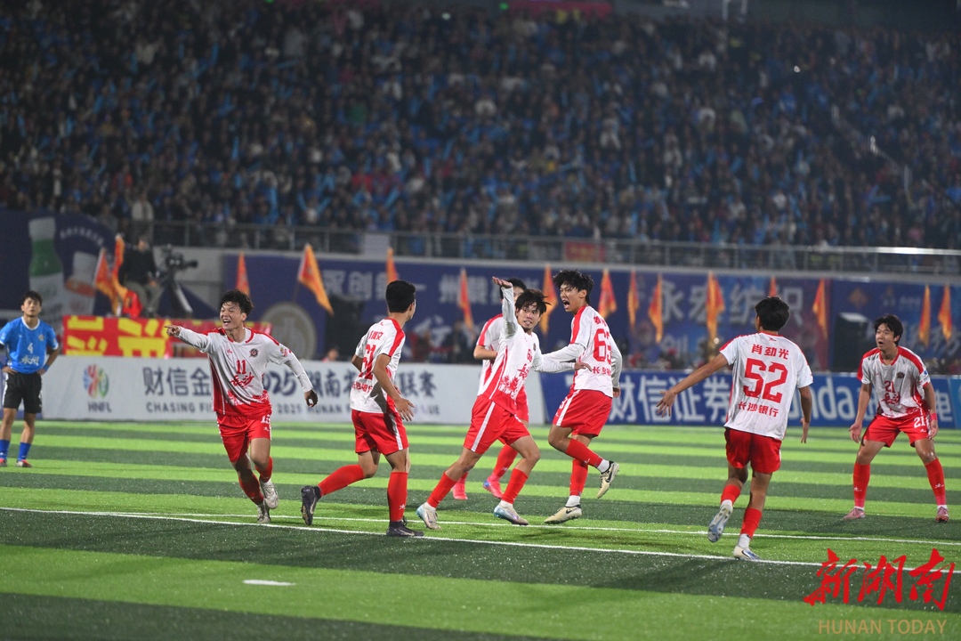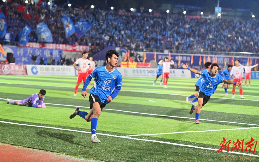 10月26日晚,永州队球员在进球后欢呼。当晚,湘超联赛第七轮火热开战,永州队主场迎战长沙队,此场硬仗的热度备受关注。第9分钟,永州队先破长沙队球门,长沙队保持六轮的“金身”终于被打破。最终,永州队主场1比1战平长沙队。湖南日报全媒体记者 郭立亮 摄
