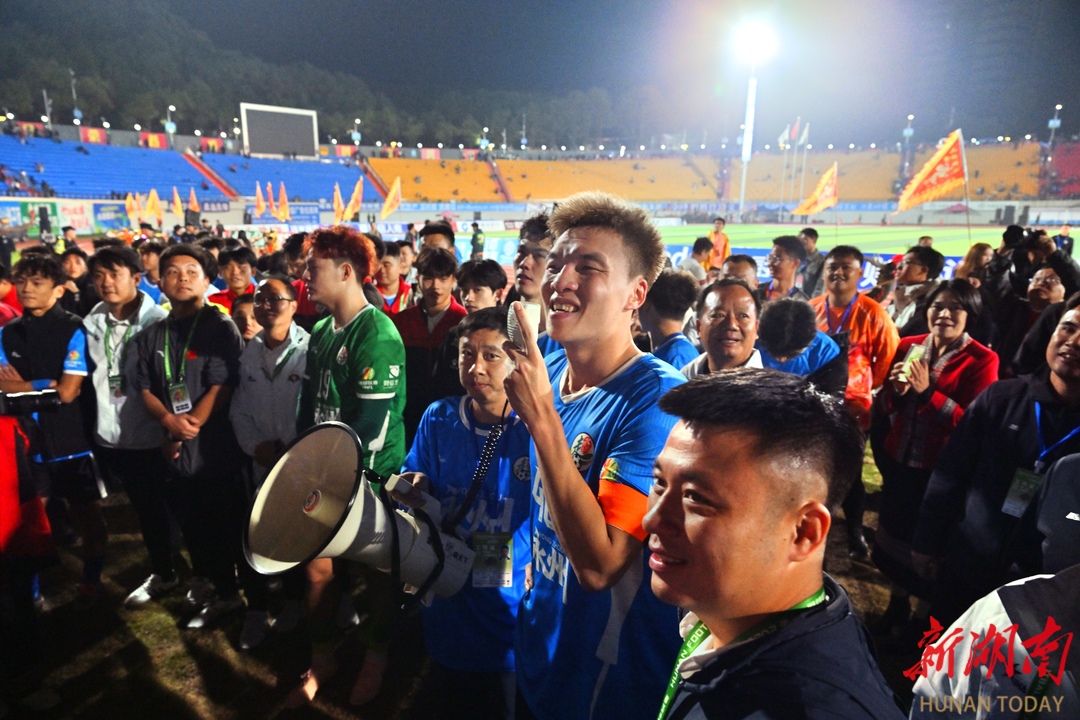 10月26日晚,赛后球员与球迷交流。当晚,湘超联赛第七轮火热开战,永州队主场迎战长沙队,此场硬仗的热度备受关注。第9分钟,永州队先破长沙队球门,长沙队保持六轮的“金身”终于被打破。最终,永州队主场1比1战平长沙队。湖南日报全媒体记者 郭立亮 摄