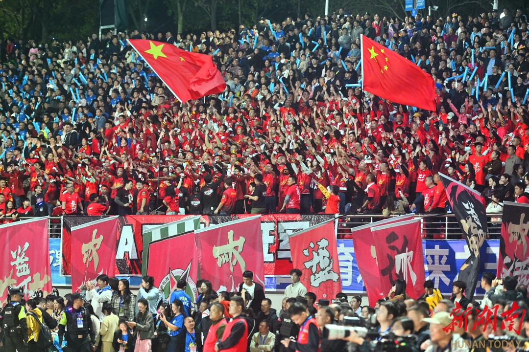 10月26日晚,球迷在加油助威。当晚,湘超联赛第七轮火热开战,永州队主场迎战长沙队,此场硬仗的热度备受关注。第9分钟,永州队先破长沙队球门,长沙队保持六轮的“金身”终于被打破。最终,永州队主场1比1战平长沙队。湖南日报全媒体记者 郭立亮 摄