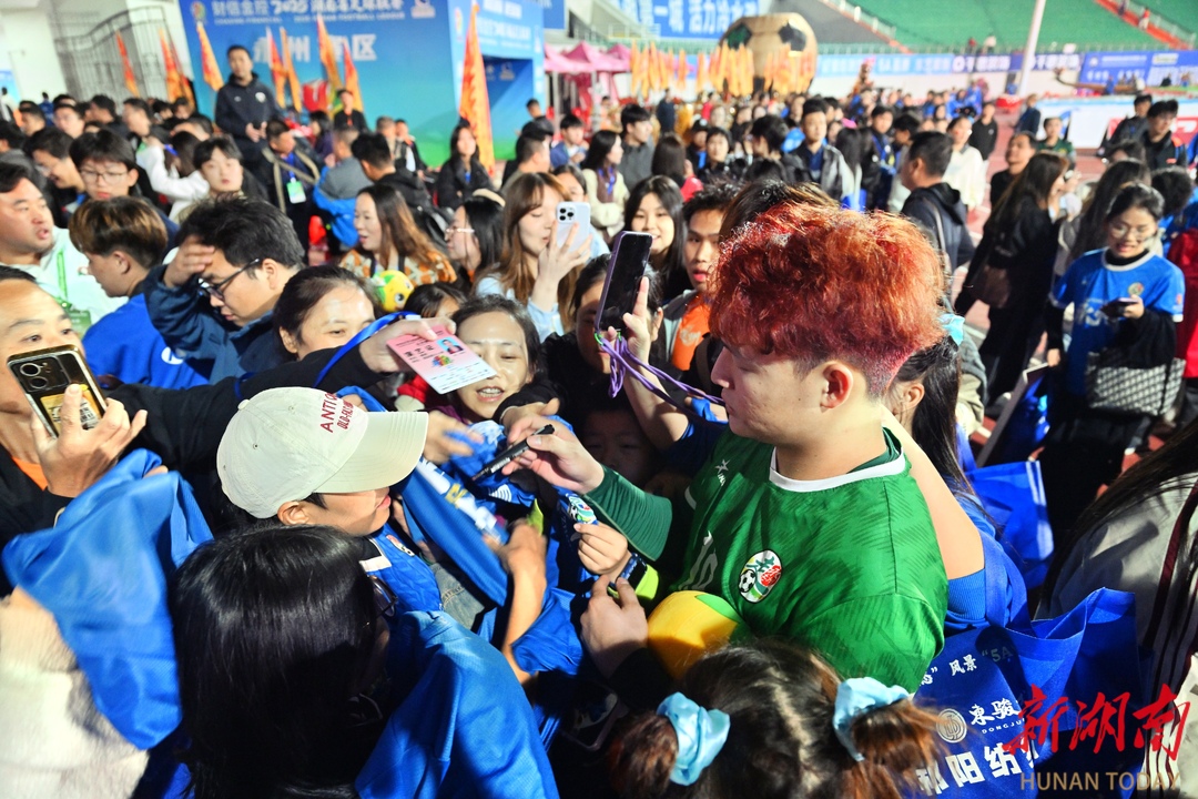 10月26日晚,赛后球员为球迷签字。当晚,湘超联赛第七轮火热开战,永州队主场迎战长沙队,此场硬仗的热度备受关注。第9分钟,永州队先破长沙队球门,长沙队保持六轮的“金身”终于被打破。最终,永州队主场1比1战平长沙队。湖南日报全媒体记者 郭立亮 摄