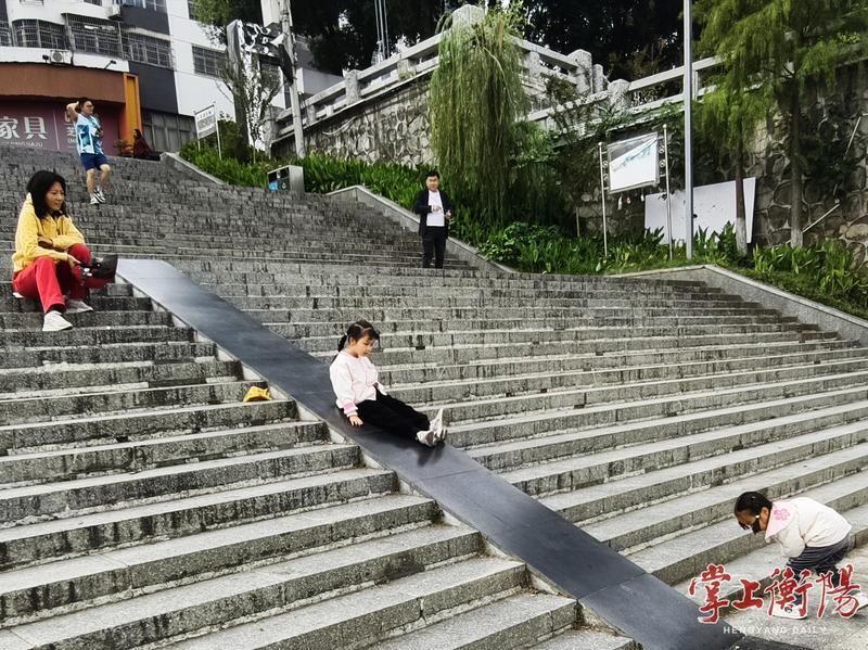 秋高气爽,家长领着孩子在湘江西岸亲水平台游玩。