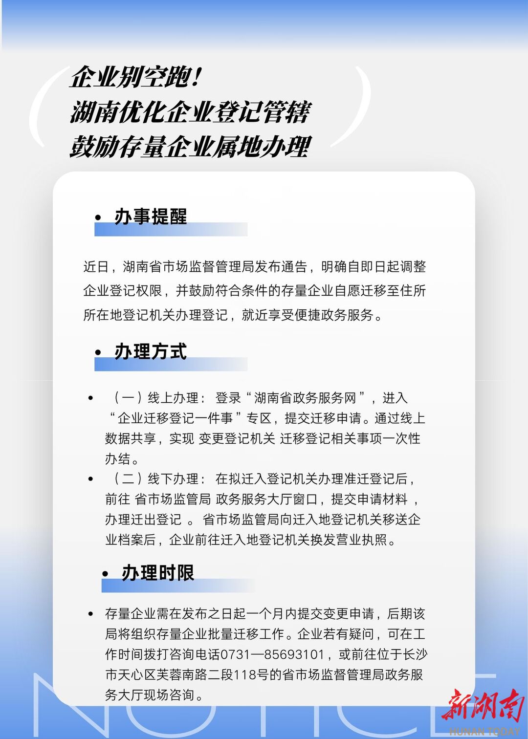 通告明确,存量企业需在发布之日起一个月内提交变更申请,后期该局将组织存量企业批量迁移工作。企业若有疑问,可在工作时间拨打咨询电话0731—85693101,或前往位于长沙市天心区芙蓉南路二段118号的省市场监督管理局政务服务大厅现场咨询。