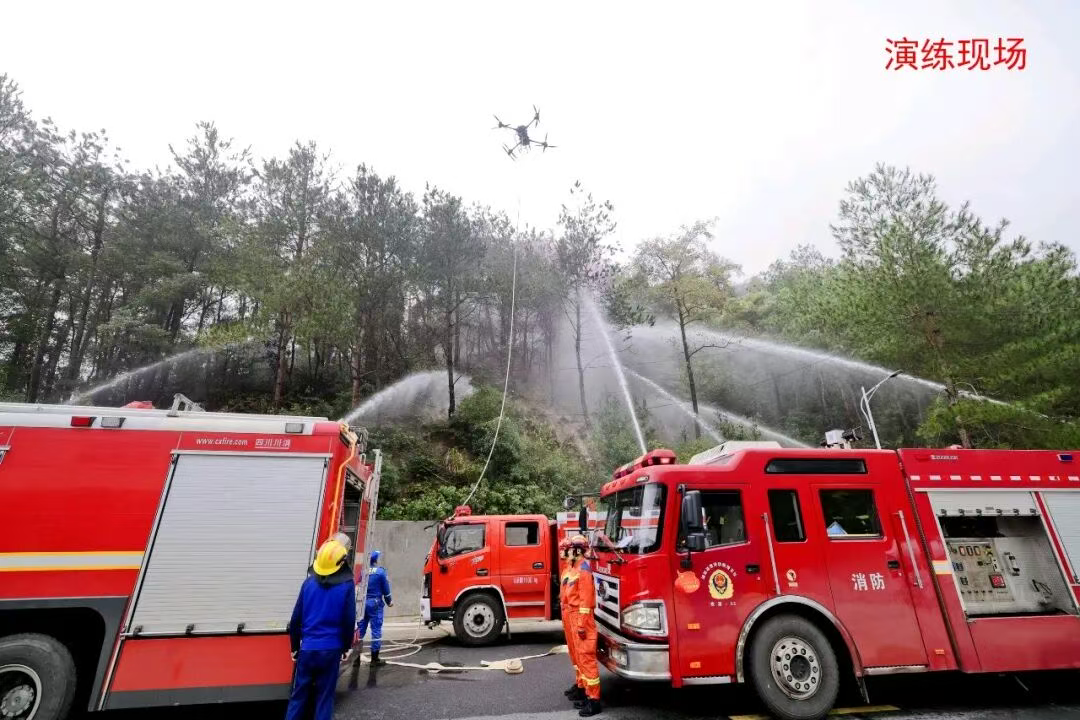 随着火情升级,县启动森林火灾Ⅱ级响应,调集县综合应急救援队、消防救援大队等力量增援。现场以“以水灭火”为核心战术,通过管线车补水、高扬程水泵接力与移动水炮等装备形成立体供水网络,精准压制火点。消防车保护重点设施,无人机实时回传火场图像。各队伍协同完成重要目标保护、扑打明火等科目,演练紧张有序,达到预期效果。