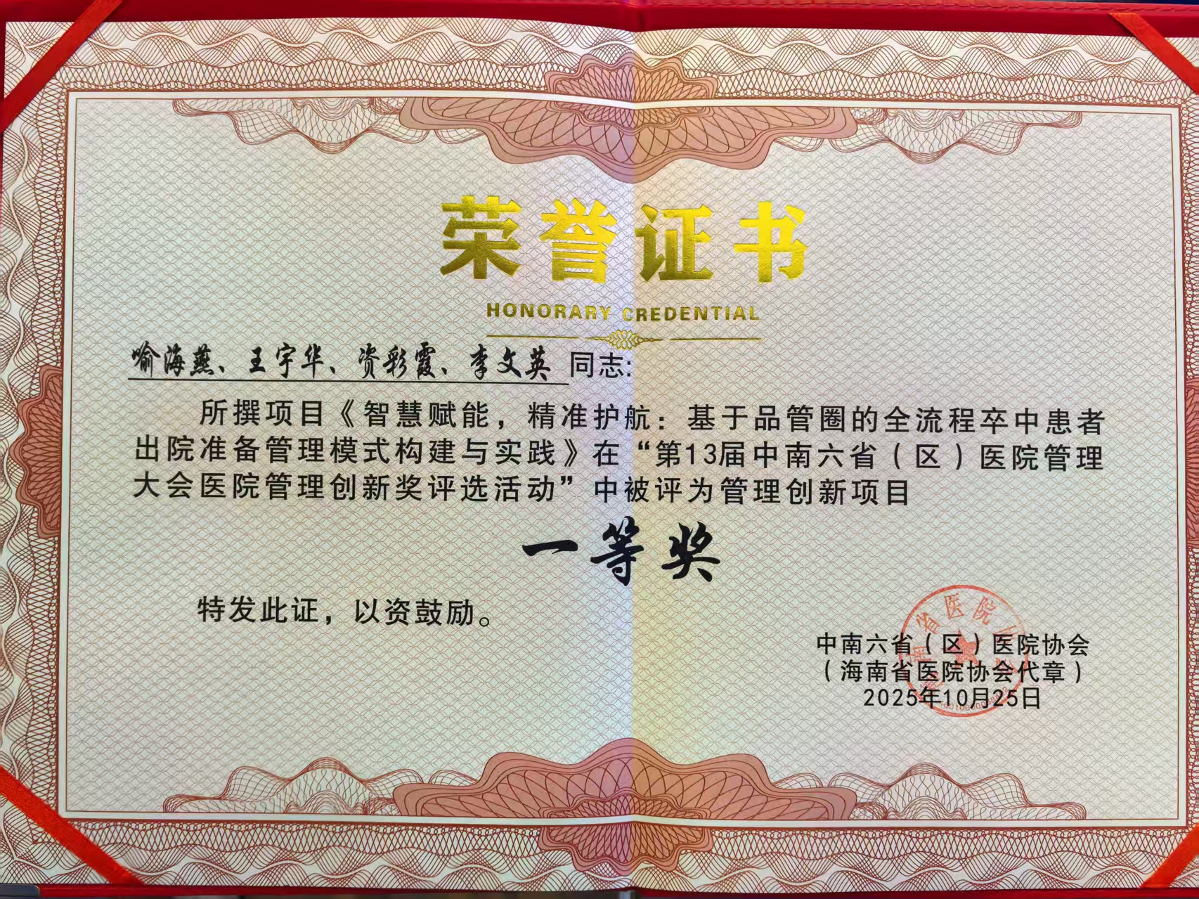湖南日报·新湖南客户端10月27日讯(通讯员 王宇华 蒋曦慜)近日,在第十三届中南六省(区)医院管理大会上,耒阳市人民医院护理团队申报的项目——《智慧赋能,精准护航:基于品管圈的全流程卒中患者出院准备管理模式构建与实践》,荣获“医院管理创新奖”一等奖,成为湖南省医院管理创新领域的优秀代表。