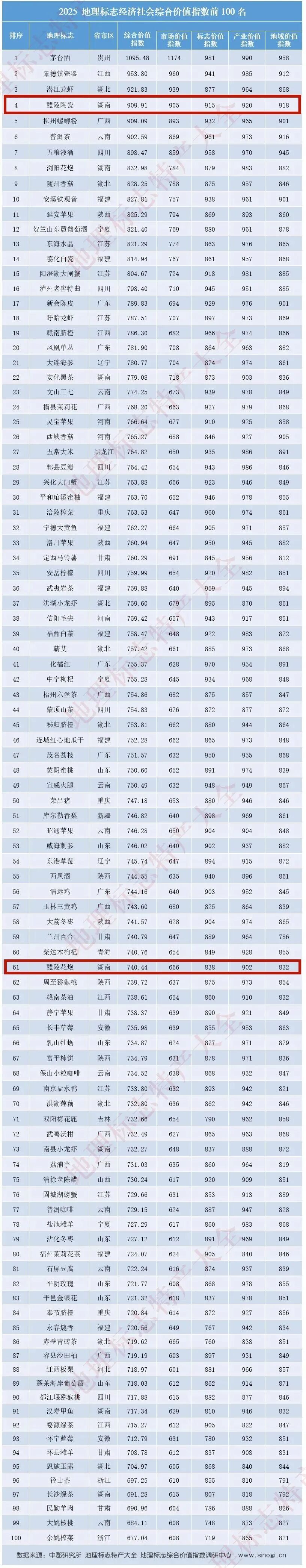 湖南日报·新湖南客户端10月27日讯(通讯员 龙倩 彭昕炜)日前,全国地理标志和县域经济专业研究机构——北京中郡经济发展研究所与地理标志特产大全网(www.sinogi.cn),完成并发布了《2025地理标志经济社会综合价值指数调研报告》,揭晓2025全国地理标志经济社会综合价值百强名单。其中,醴陵陶瓷和醴陵花炮分别位列第4名、第61名。
