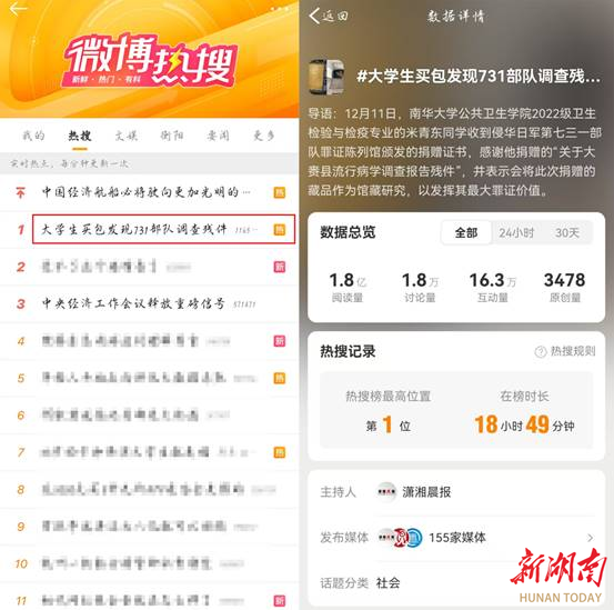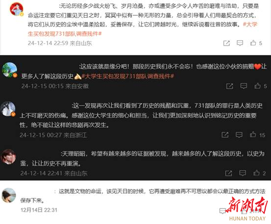 米青东捐赠史料的事迹经媒体报道后,迅速引发全社会强烈反响。新华社、人民日报、光明日报、央视新闻等30余家权威媒体聚焦报道,微博话题“大学生买包发现731部队调查残件”冲上热搜榜第一,短时间内阅读量达1.8亿,讨论量超过1.8万。相关话题在百度、B站等平台同步登顶热搜,全网综合传播量突破2亿次。