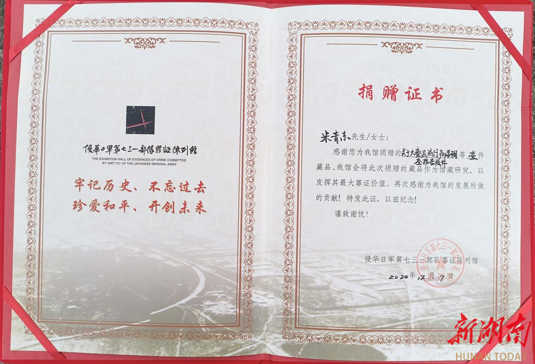 12月11日,米青东收到了侵华日军第七三一部队罪证陈列馆颁发的捐赠证书,证书上写道:“感谢您捐赠的‘关于大赉县流行病学调查报告残件 ’,我馆将作为馆藏研究,以发挥其最大罪证价值”。从偶然发现到专业鉴定,从无偿捐赠到正式入藏,这位“00 后”大学生用果断行动完成了一次跨越千里的历史对话。