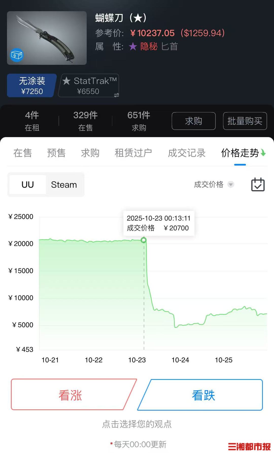 记者调查发现,此轮饰品的降价幅度堪称“腰斩级”,多款高端饰品价格集体砍半。玩家们常用的交易软件“悠悠有品”显示,一款“运动手套|迈阿密风云(略有磨损)”在10月23日售价超3万元,第二日价格直接“跳水”至7000元左右。而一款此前2万元左右的蝴蝶刀一夜之间直接跌至5000元,“运动手套|夜行衣”价格趋势类似,从2万元跌至6000余元。记者浏览发现多款热门道具的价格走势都历经了断崖式下滑,且跌幅普遍超出50%。
