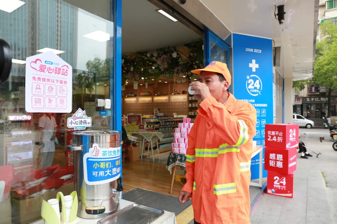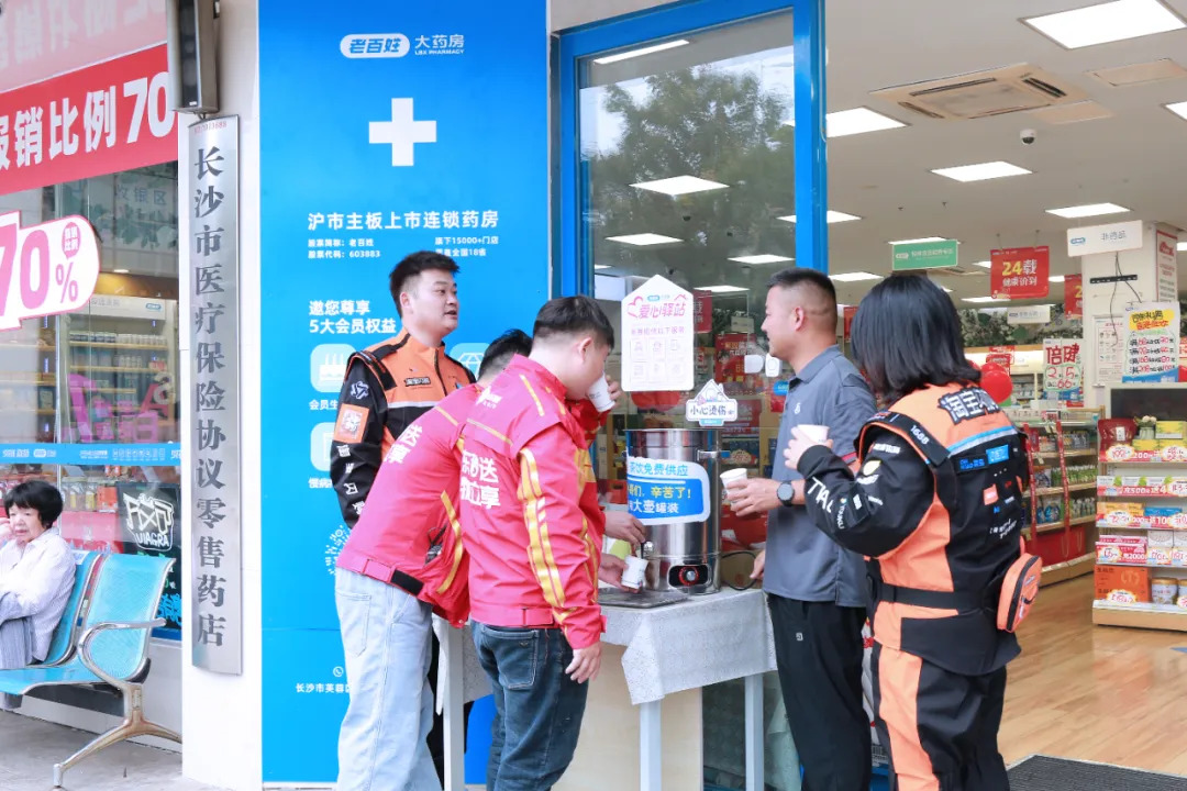 “小哥们辛苦了,可用大壶灌装。”位于长沙市万家丽路的老百姓大药房“爱心驿站”内,张贴着这样一句醒目的标语。
