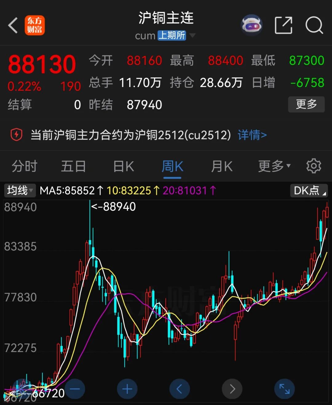 最新数据显示,上海铜期货主力合约价格已经站上了88300元/吨上方,伦敦LME铜报价则突破1.1万美元/吨,双双逼近历史高点。