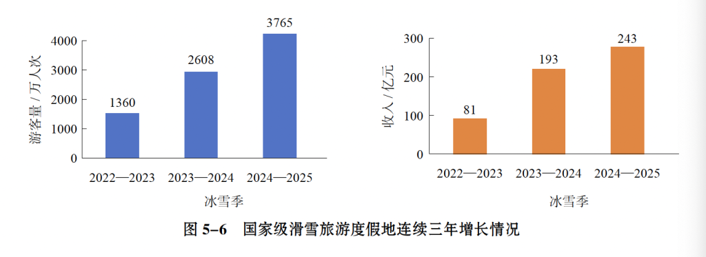 《报告》显示,2024-2025冰雪季,我国26家国家级滑雪旅游度假地接待人次和实现收入连续三个冰雪季实现快速增长。其中,接待滑雪旅游总人次达2765万,同比增长25%,旅游总收入达243亿元,同比增长34%。