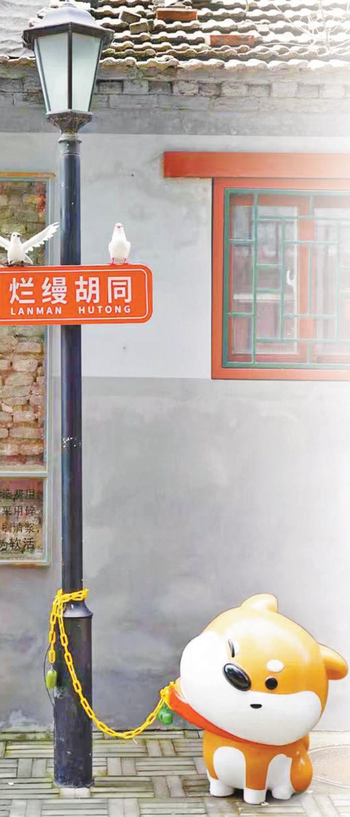 (烂缦胡同路牌下的宠物小狗成为胡同标志性景观)