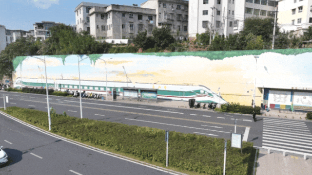 在田心路建宁驿站对面,另一幅3D立体彩绘同样引人注目:一列“韶山号”电力机车仿佛正从深邃隧道中呼啸而出,车头蒸汽喷薄,光影交错,车身线条流畅有力,强烈的透视效果让人仿佛置身于机车启程的瞬间。不少市民摆出“与机车同框”的姿势拍照留念,孩子们更是兴奋地喊着“火车要开出来啦!”