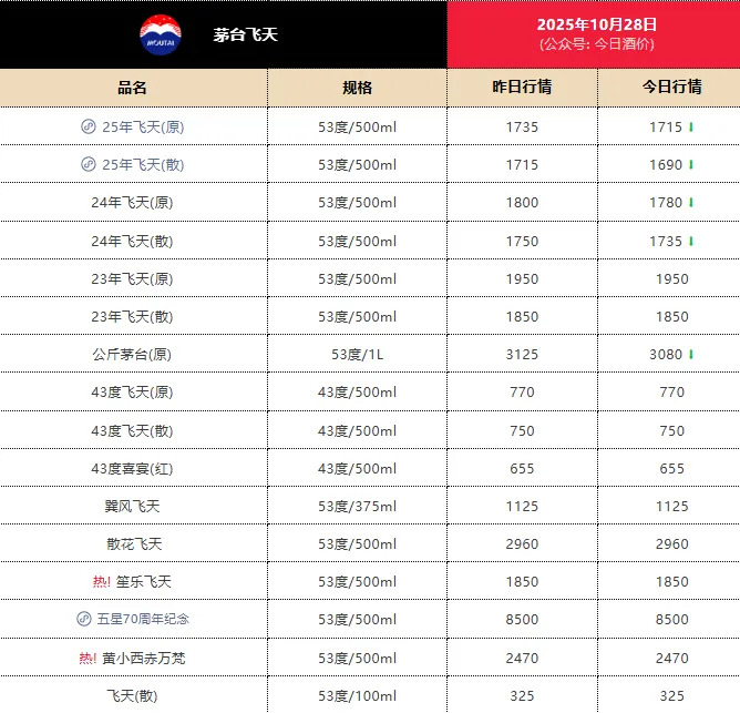酒类行情监测平台“今日酒价”数据显示,2025年53度500ml飞天茅台散瓶批发参考价报1690元,较前一日下跌25元,首次跌破1700元/瓶大关,再创上市以来的新低;原箱报1715元,较前一日下跌20元。两款产品较上线时的2220元、2255元累计跌幅均已超过31%。