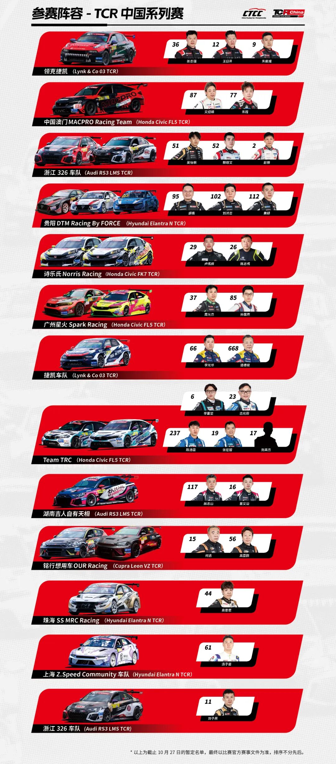 参赛阵容方面,领克捷凯车队、中国澳门MACPRO Racing Team、浙江326车队、湖南吉人自有天相车队、诗乐氏Norris Racing、广州星火Spark Racing、捷凯车队、贵阳DTM Racing By FORCE、铭行想用车OUR Racing、珠海SS MRC Racing、Team TRC、上海Z.Speed Community车队等劲旅悉数出战,全力争夺年度殊荣。