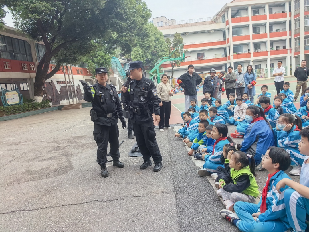 互动体验环节成为现场的“人气焦点”。现场演示以生动的特警装备展示拉开帷幕。在特警队员的邀请下,黄兴小学安全专干胡华老师指尖刚接触电击抓捕手套,便清晰感受到麻感。“这还是最低电量哦!”宁警官介绍,手套上的黑色储电盒能通过接触皮肤放电,既保障抓捕安全,又避免过度伤害。随后,特警队员手持多功能约束抓捕器,一边演示3米多长的钢叉展开动作,一边向孩子们讲解其双重功能:锯齿边缘的钢叉可快速圈定可疑人员,内置电击装置启动时发出的“滋滋”电流声,让孩子们直观感受到装备的威慑力。随后亮相的警用盾牌更让孩子们眼前一亮:特警按下开关,盾牌前方3盏灯瞬间闪烁,同时发出刺耳的驱散噪音,“这种声音能干扰坏人的判断,保护我们自己!”队员通俗易懂的讲解,让安全知识深深印在孩子们心中。直观的体验让在场师生对装备功能有了更深刻的认识。幼儿园的小朋友则在老师带领下,近距离观察被戏称为“玫瑰金手镯”的手铐,特警队员用趣味语言讲解锁闭原理,将严肃的安全知识转化为孩子们能理解的内容。