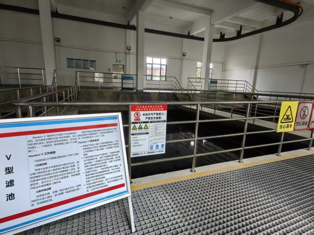 记者看到,在V型滤池里,1.2米厚的石英砂如同一个高密度筛子,把更细小的杂质筛出去。