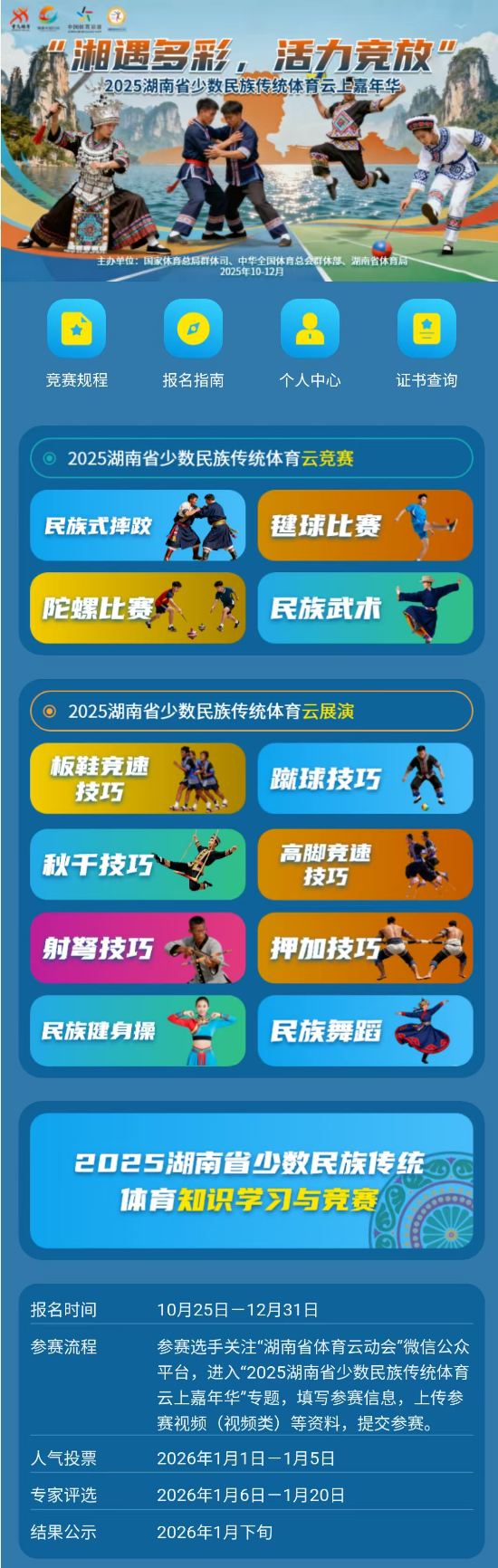 即日起至12月31日,参赛者只需关注“湖南省体育云动会”微信公众号,进入活动专题页面,即可便捷完成报名,按要求上传参赛视频(横屏拍摄,MP4/MOV/MPEG格式,不低于720P)或参与知识答题。
