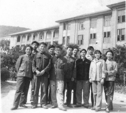 1980年,77级3班4组及部分同学在湖南师院中文系教学楼前合影(后排右二:韩少功)。