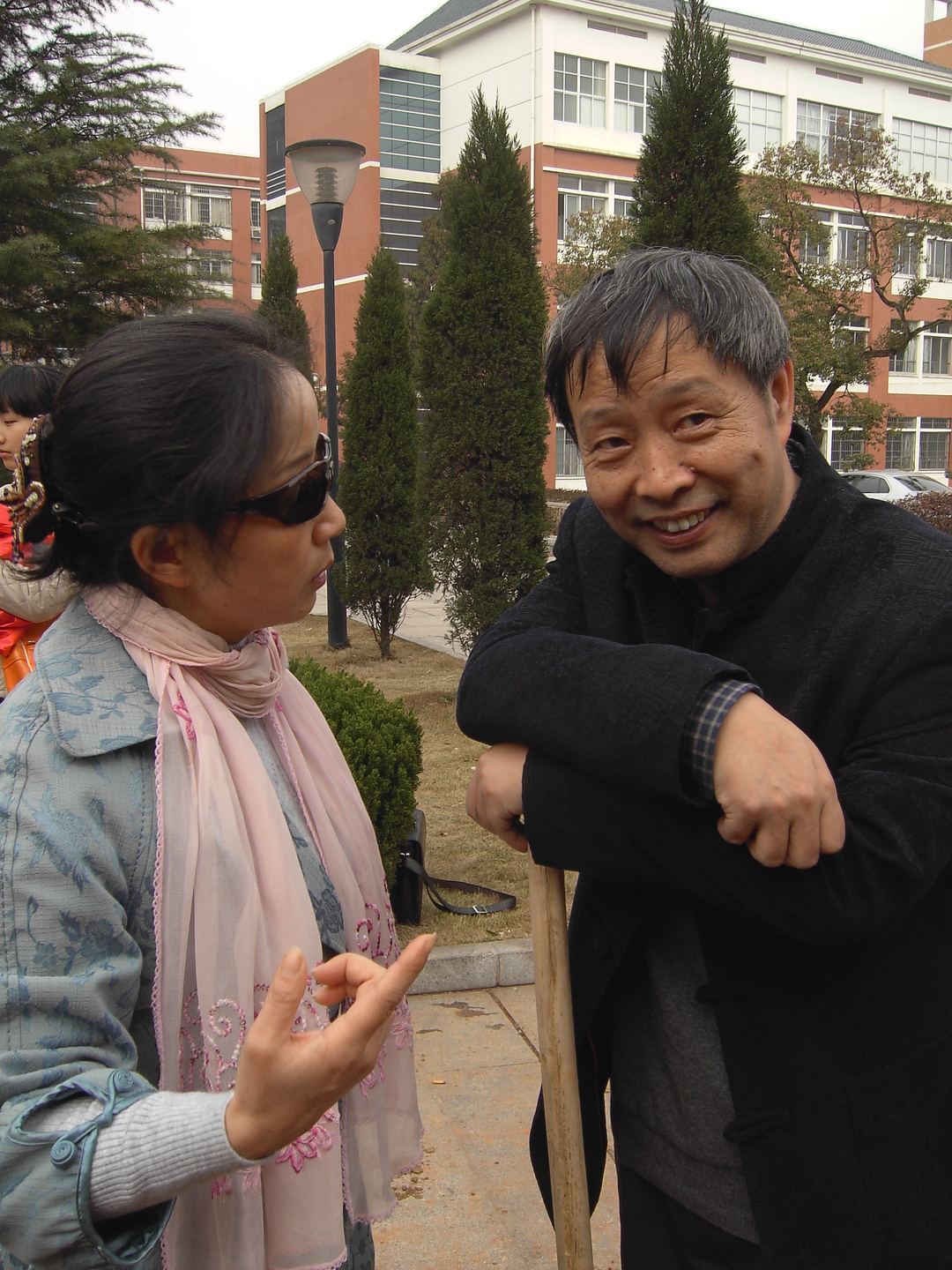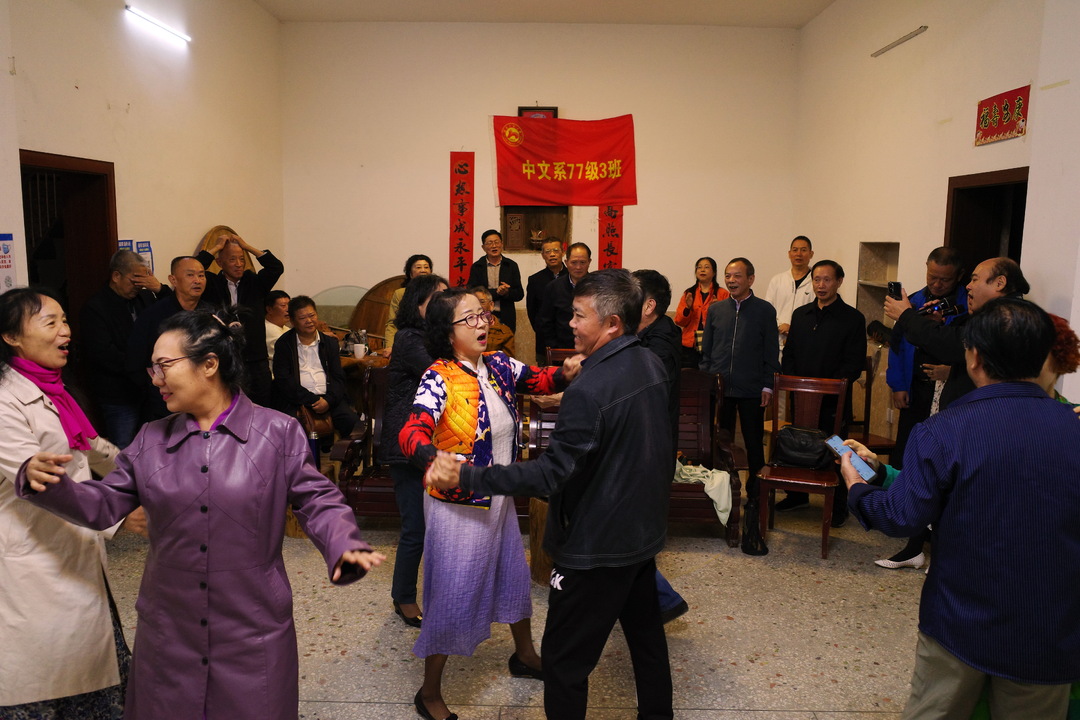 韩少功与黄瑛同学交谈,黄瑛也是留母校教书,她组织班级活动十分热心)。