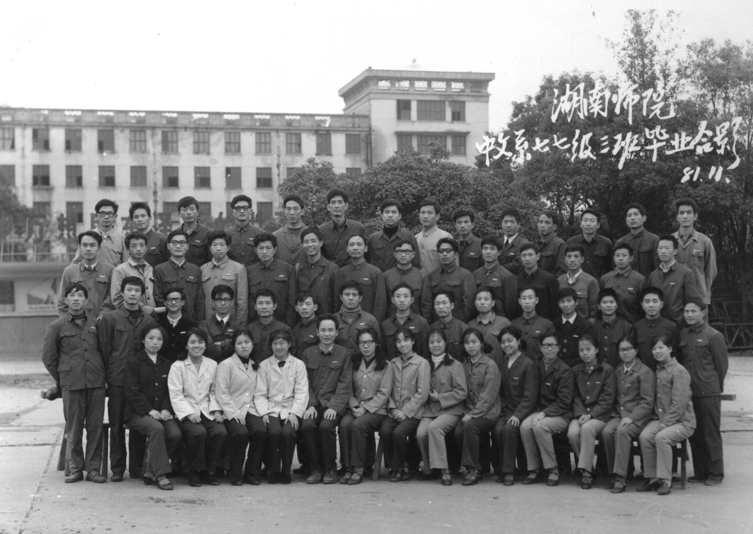 1981年11月,湖南师院中文系77级3班毕业合影(三排左六:韩少功;一排左六:77级学生干事龚正荣老师)。