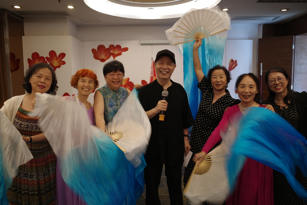 3班文娱委员杨晓萍带女生出场跳舞,男同学感叹:女同学仍有当年迷人的风采(右起:钱颂希、郑宪春、罗天明、张海沙)。