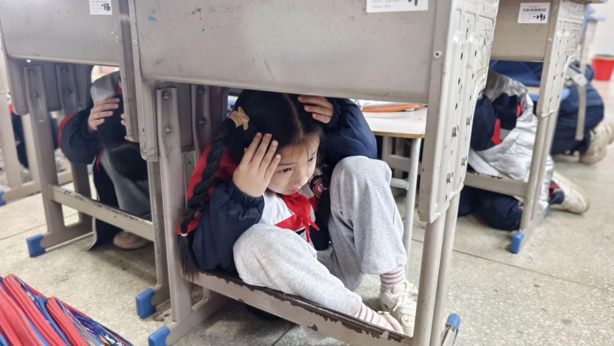 警报声骤然响起,打破校园宁静,教学楼迅速进入“战时状态”。学生们立即蜷身躲入课桌下方,双手稳固护头,完成标准避险动作;教师同步抵达楼道安全岗,守护关键通行节点。随着疏散指令发布,学生在班主任引导下沿预定路线快速有序向操场转移。整个过程无人推挤、无人折返、无人喧哗,只有密集而沉稳的脚步声在走廊回响。到达操场后,各班迅速蹲地待命,班主任逐一清点人数,很快,全员安全集结的消息在晨光中传遍全场。