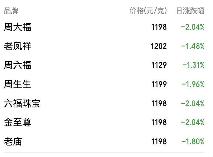 国内黄金饰品克价也多数跌破1200元。10月28日,周大福足金(饰品、工艺品类)价格为1198元/克,周生生足金饰品价格为1199元/克,老庙足金饰品价格为1198元/克,老凤祥足金零售价为1202元/克,周六福足金饰品价格为1129元/克。