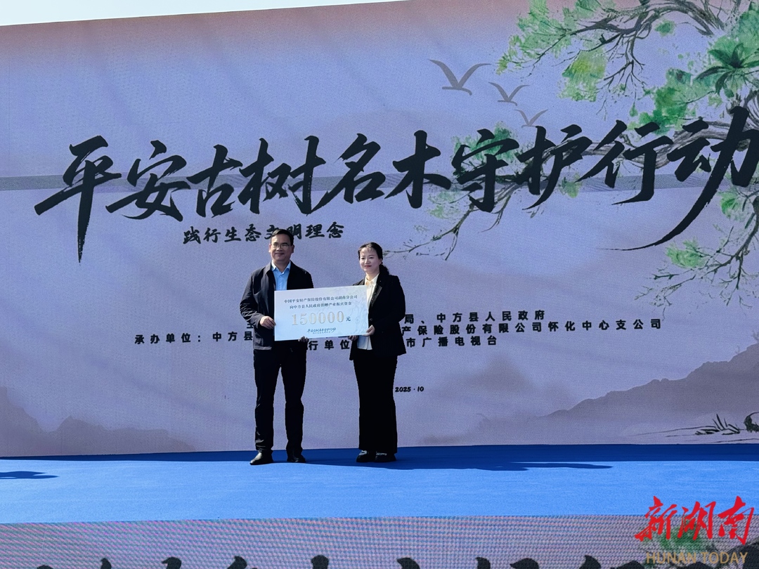 活动现场,平安产险湖南分公司向中方县捐赠“振兴保”公益项目及“护林人员意外保险”,为长期坚守一线的护林人员提供暖心风险保障。在“平安守护树”挂牌与认养环节,嘉宾们亲手为古树悬挂定制铭牌,建立起公众与古树之间的情感联结,营造“人人关心、人人参与、人人守护”的良好氛围。