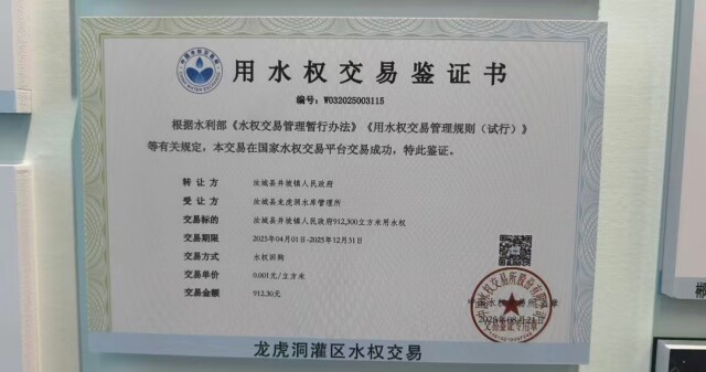 2025年7月,依托中国水权交易平台,龙虎洞灌区将回购来的水权,与城溪电站进行了跨行交易,交易水量300万立方米,金额6万元,实现了灌区结余水量与发电用水交易零的突破,而且是全省首例。