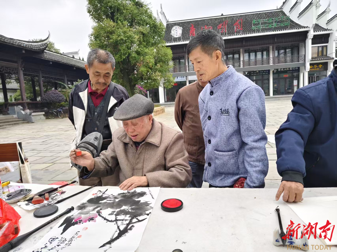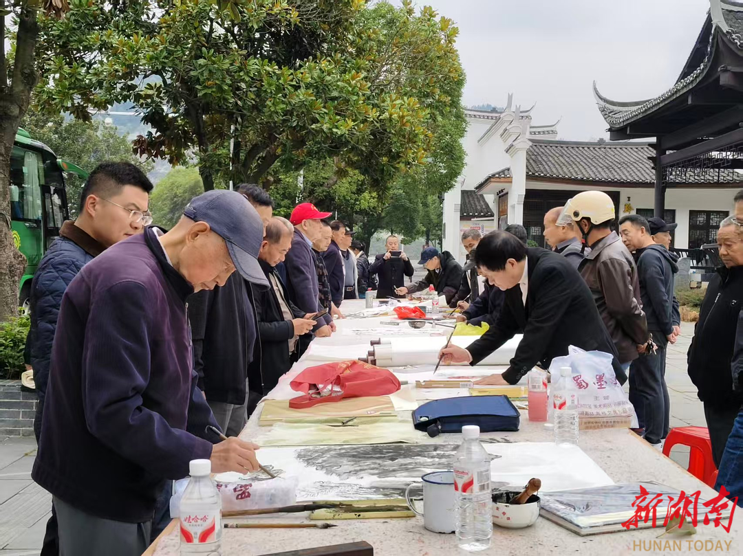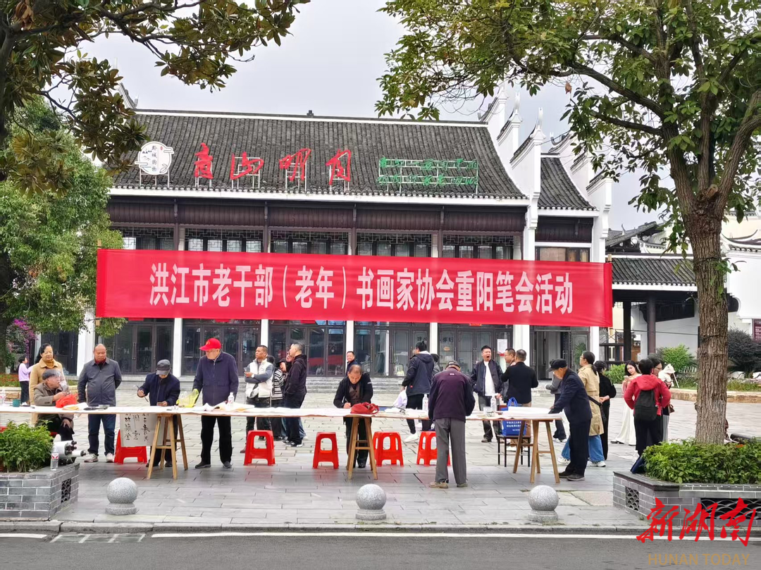 湖南日报·新湖南客户端10月28日讯(通讯员 邬国荣 李志湖)28日,重阳佳节来临之际,洪江市黔阳古城东门口墨香四溢,人头攒动。洪江市老干部(老年)书画家协会的16位书画精英在此挥毫泼墨,以一场别开生面的笔会共庆佳节。他们中有多达10位是市关心下一代工作委员会“银发工作站”的“五老”成员,在展示艺术风采的同时,更以实际行动传承着文化薪火。