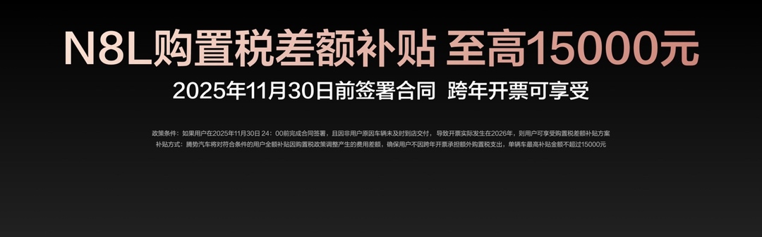 此外,凡在2025年11月30日24点前完成合同签署的用户,如果因非用户原因车辆未及时交付,导致开票实际发生在2026年,可享受腾势提供的购置税差额补贴,最高1.5万元。
