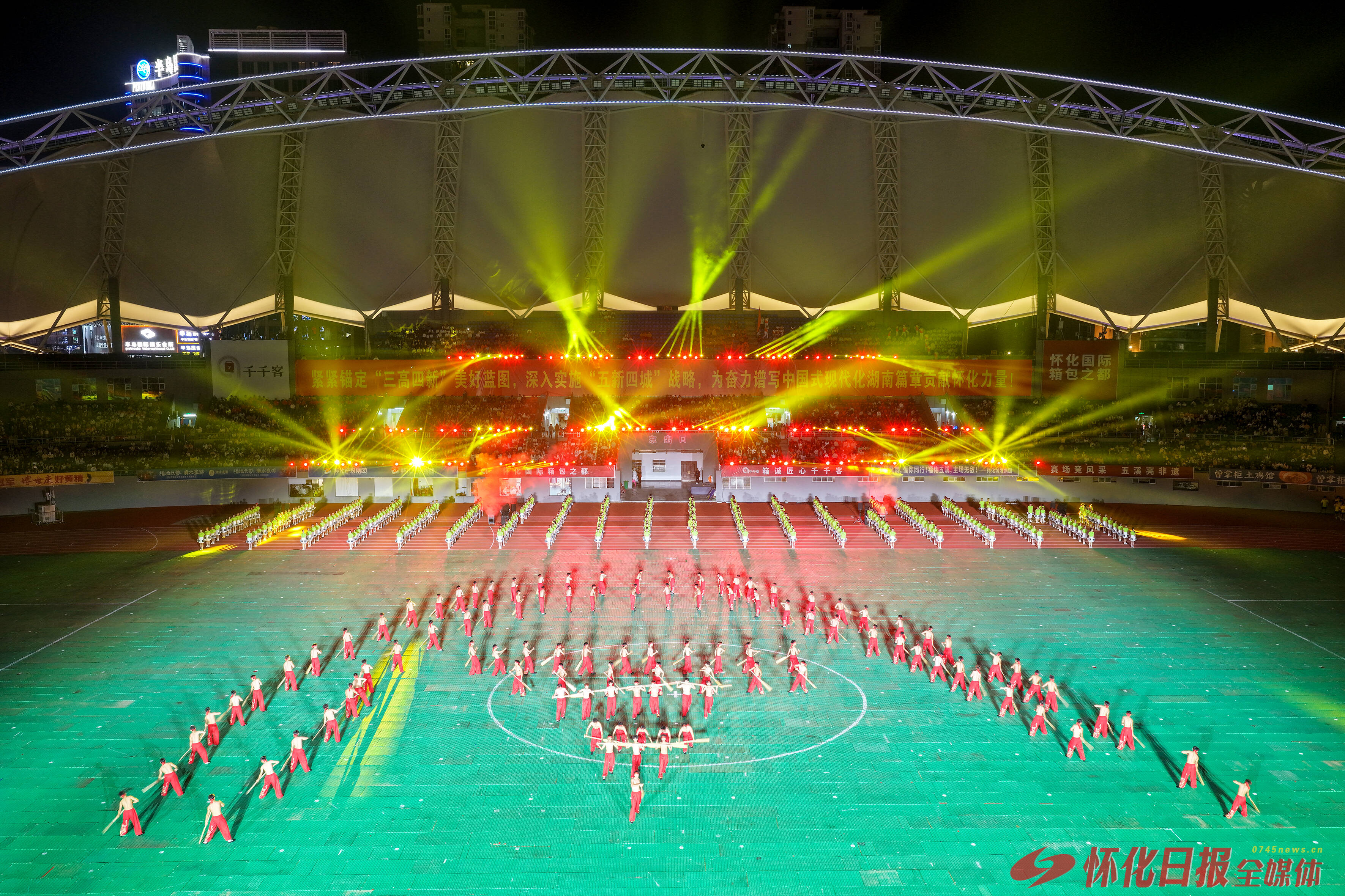 (10月28日晚,怀化市第七届运动会在市体育中心开幕 。来自13个县(市、区)的健儿参赛,涵盖老中青群体,他们将在多个项目中展开角逐 。图为开幕式文艺演出现场。怀化日报全媒体记者 潘雨 摄)