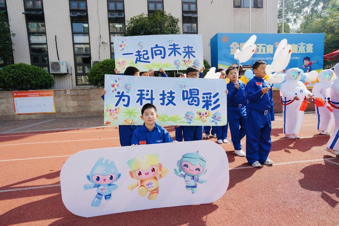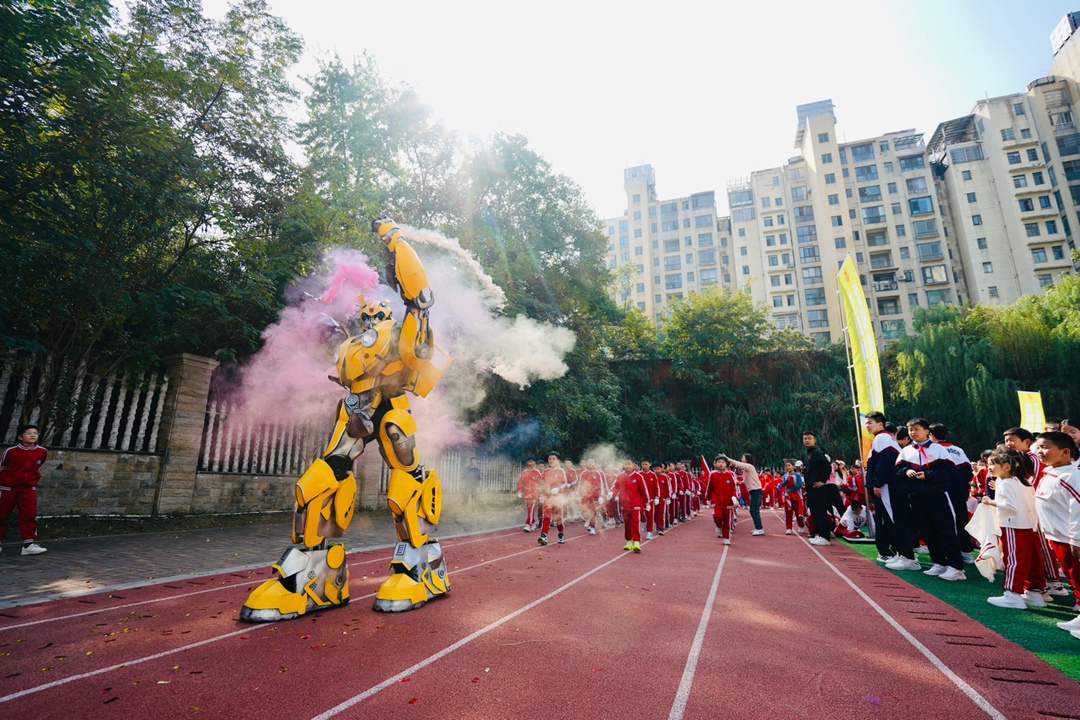 未来已来,远方不远。五、六年级学子带来的“接力·启航”篇章将入场式推向高潮。他们以科技与AI为主题,身着创意机甲服饰,操控机器人模型,在充满未来感的音乐中,勾勒出一幅“一起向未来”的奇幻图景,展现出对科技世界的无限憧憬。