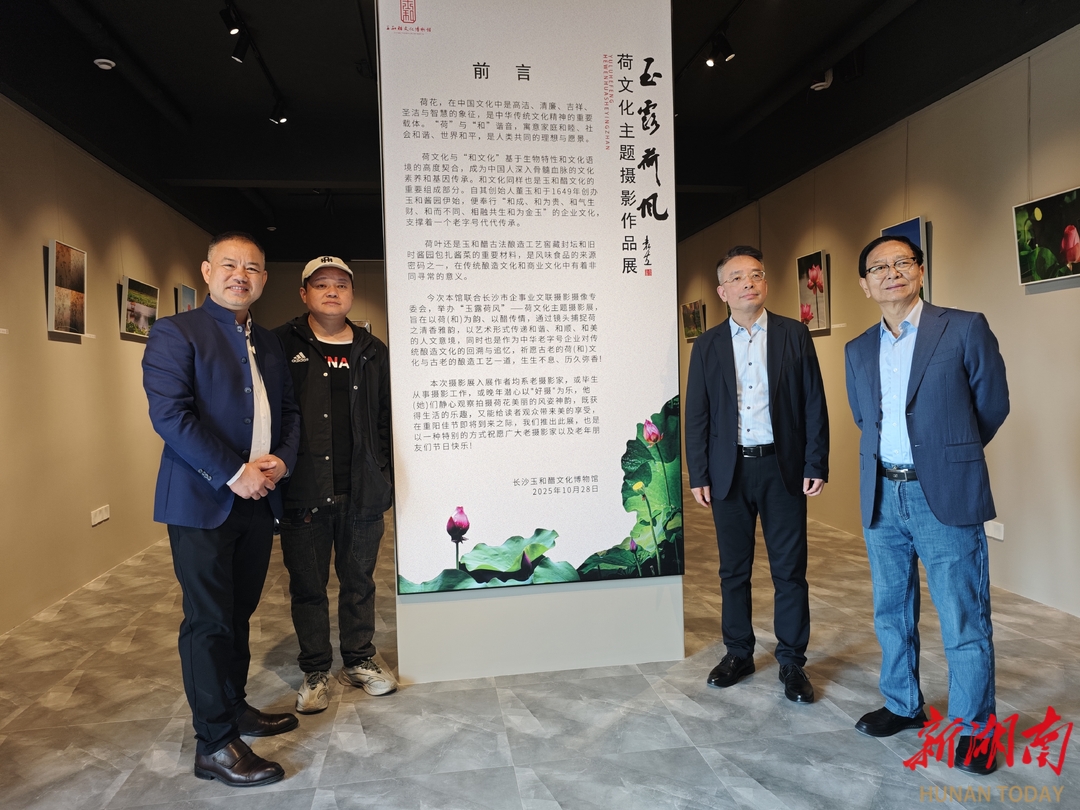 展览承办方长沙玉和醋文化博物馆馆长袁立介绍了举办此次荷花专题展览的初衷和宗旨。他说,玉露荷风,原是玉和醋文化博物馆的基本陈列之一,荷是玉和醋古法酿醋技艺的重要材料,在汉字中,“荷”与“和”谐音,“荷”与“和”通意;在传统诗画艺术中,“荷”已成为“和”的代称。“和文化”既是中华传统文化的优秀内核,也是中华老字号玉和醋企业文化的重要内涵之一。今天以“荷”为题进行摄影创作展览,是传承弘扬“和”文化的一种独特方式。一朵荷花,一个和字,承载着摄影家们对家庭和美、社会和谐乃至世界和平的美好祝愿和期盼。
