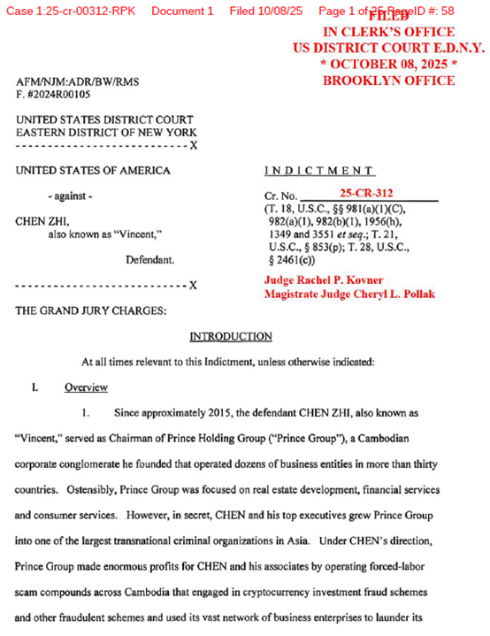 (一)美国的刑事程序。纽约东区联邦检察官办公室于2025年10月8日向联邦地区法院提交了对陈志的起诉书,并于10月14日正式宣布解封。