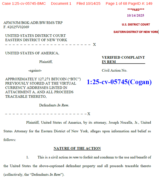 (二)美国的民事没收程序。鉴于陈志本人未归案,美国司法部同时采取了民事司法没收手段来处置查获的巨额比特币资产。2025年10月14日,美国司法部国家安全司与纽约东区检察官办公室联合向法院提交了一份长达68页的民事没收起诉书,针对约127,271枚比特币提起没收诉讼,案号为25-cv-5745。