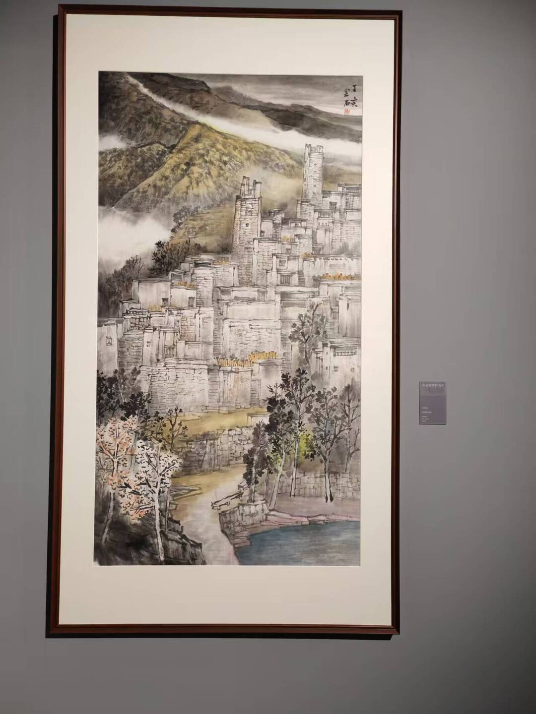 王金石对山水画笔墨的干湿浓淡有着精准的把控,他遵循“墨分五色”(焦、浓、重、淡、清)的传统理论,通过笔墨的变化赋予山水丰富的情感与生命力。在《湘西春早》中,描绘初春的树木时,他选用淡墨进行渲染,墨色清新淡雅,如同初春时节刚刚萌发的嫩叶,娇嫩欲滴,充满了生机与活力,仿佛能让人感受到春天万物复苏的气息;而在《山里人家》中,描绘秋日的树叶时,他则运用浓墨,甚至融入少量赭石、朱砂等色彩,墨色浓郁厚重,展现出秋叶的绚烂多彩,如同丰收时节的热闹景象,传递出丰收的喜悦之情。《湘江源》中的远山,以淡墨轻轻晕染,墨色清淡,如同远处传来的一声轻叹,空灵而悠远;近山则用浓墨重彩皴擦,墨色厚重,如同一声响亮的呐喊,雄浑而有力。《侗乡》中,侗族的鼓楼、吊脚楼用干笔勾勒轮廓,笔触干涩,墨色较淡,线条硬朗,展现出建筑的古朴与坚实;而背景的山峦则用湿墨涂抹,墨色湿润,晕染自然,线条柔和,营造出朦胧的意境,干笔与湿墨的对比,让建筑在山水间更加突出,同时也使画面更富层次感。这种枯荣浓淡的笔墨变化,让山水不再是冰冷的自然景观,而是有了情绪、有了温度的生命体,充满了诗意。