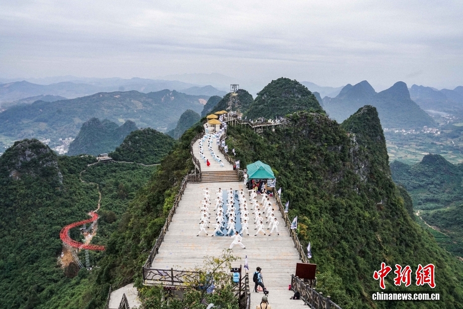 重阳登高习俗源于秋季此时的气候特点以及古人对山岳的崇拜。图为广西桂林市阳朔县在如意峰景区组织开展千人切磋太极、万人登高祈福系列活动。