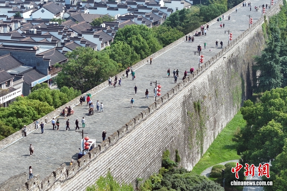 除了领略自然美景,一览城市风光也是重阳登高不错的选择。重阳节,江苏南京的民众登上六百多岁的明城墙中华门段健步走。(无人机照片)