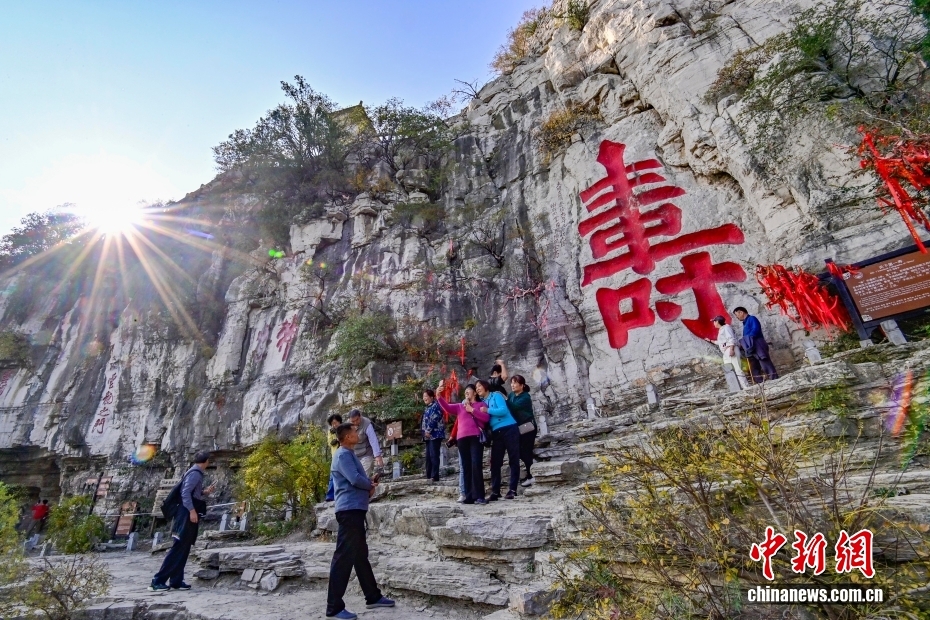 古代民间在重阳节便有登高的风俗,故重阳节又叫“登高节”。图为游客在重阳节来到山东省青州市云门山景区摩崖石刻“寿”字旁拍照留念。