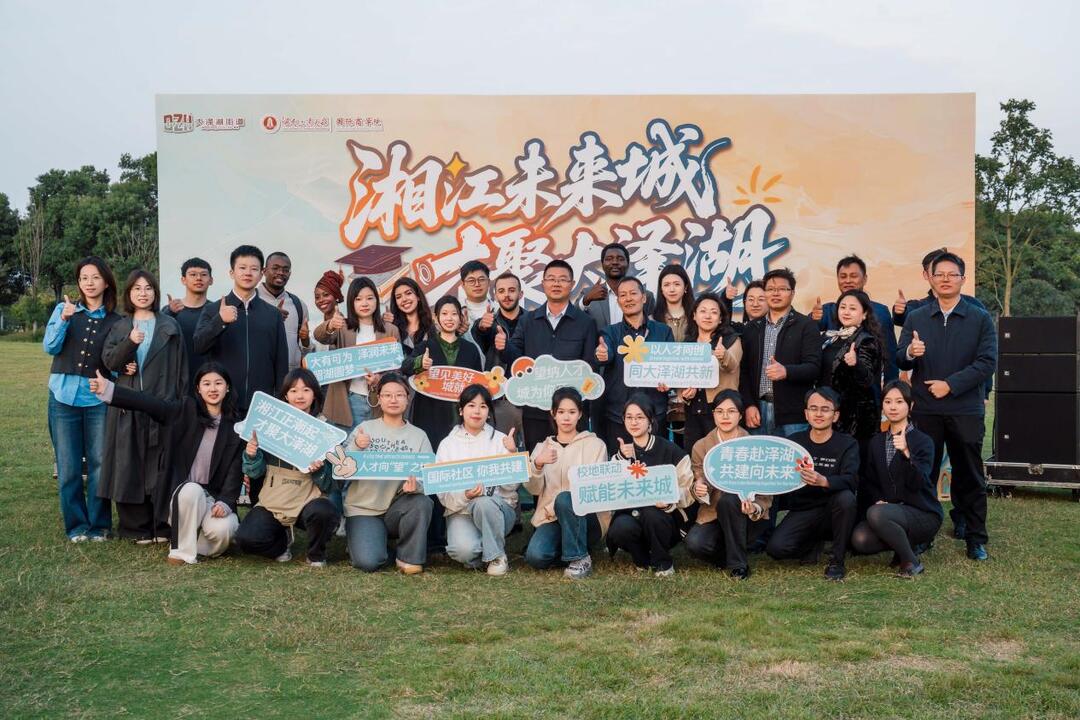 参观结束后,一场友好而热烈的长桌座谈会在美丽的大泽湖湿地公园举行。望城区高层次人才服务发展中心王聪勇博士和团区委副书记谭佳茂,分别就国际人才社区的建设理念与发展情况以及《长沙市望城区兴望合伙人青年人才评定办法(试行)》政策进行了详细介绍。校方师生代表则详细阐述了中外合作办学项目的特色优势、人才培养模式以及在国际化视野、跨文化交流、前沿学科等方面的资源禀赋,期待能将学术研究成果应用于实践,服务地方经济社会发展。街道党工委书记熊昭表示,希望共建双方在“聚人气、聚力量、聚文化”共同发力,携手共创美好未来。