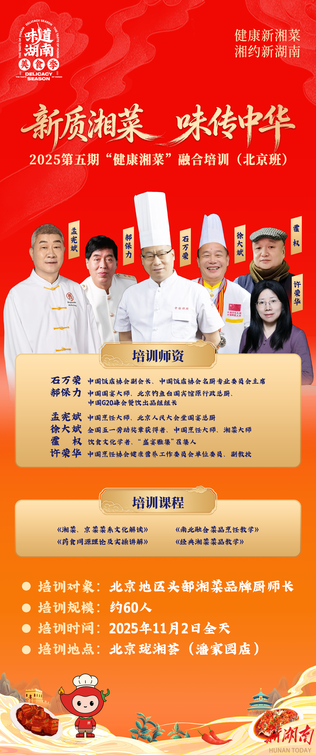作为2025“味道湖南”新质湘菜发展大会暨北京专场推广活动的特色与亮点,以 “新质湘菜 味传中华”为主题的健康湘菜融合培训,将于11 月 2 日在北京拉开帷幕,南北湘菜大师与国宴大师联袂授课,用理论与实操双重维度,解码南北菜系融合的健康密码;饮食文化专家与营养学专家同台授课,现场揭秘饮食健康之道。