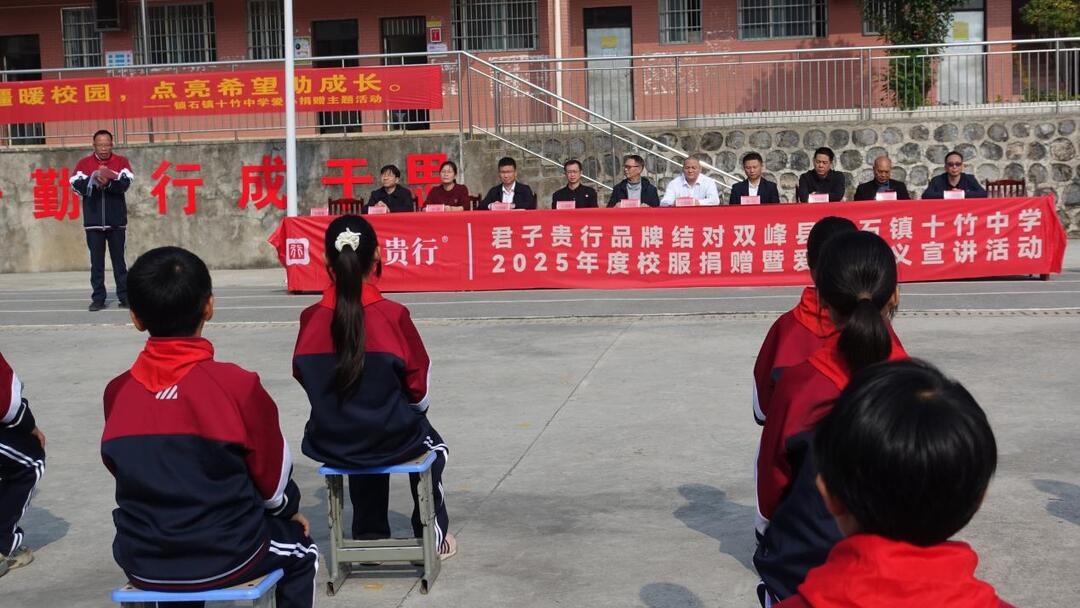 新湖南客户端10月29日讯(通讯员 王玖华 王益民 王诗盈)10月28日,双峰县锁石镇十竹中学全校师生,穿上校友王寿喜先生捐赠的“忘不了”品牌校服,参加“君子贵行品牌结对十竹中学2025年校服捐赠暨爱国主义教育宣讲活动”时,构成全场一道最靓丽的风景。
